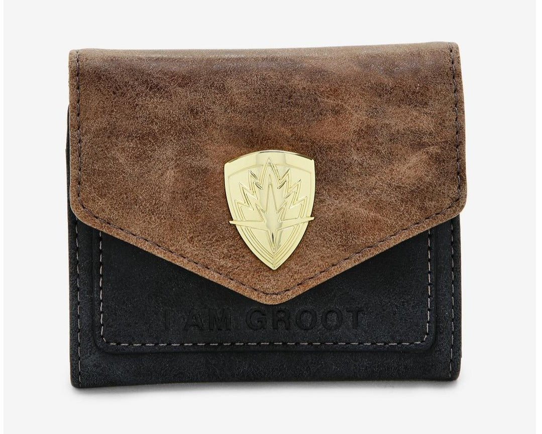 This Loungefly trifold wallet is cute and petite, just like Baby Groot! The worn faux leather exterior features a metal shield badge, debossed "I am Groot" text, and a Groot appliqué with embroidered floral details. Snap it open to reveal 5 card slots and an ID window.