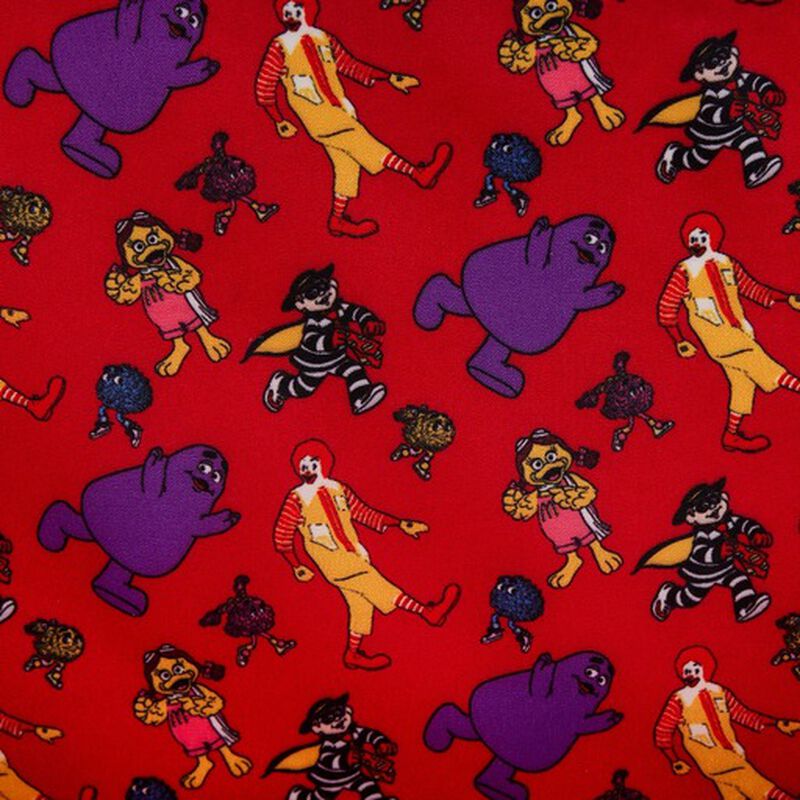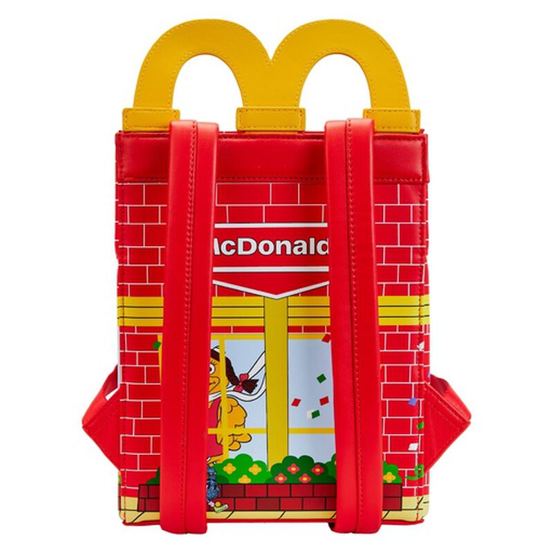 Find your happy place with our Loungefly McDonald’s® Happy Meal™ Mini Backpack. This figural backpack, shaped like a McDonald’s Happy Meal box, is filled with fun details. The red brick vegan leather façade features a window view into the festivities and characters inside. You’ll find Ronald McDonald™ passing by, with Hamburlgar™ looking through the window on the front. Side views include Grimace™ waving from inside, and the McDonald’s logo appears in the window on the other side. On the back, Birdie the Early Bird™ waves, and plenty of Fry Guys™ are scattered about, ready for a celebration. A vegan leather zipper charm of a box of McNugget Buddies™ is shipped inside the backpack in a clear bag, like a Happy Meal, and can attach to the exterior of the bag. Of course, a Happy Meal backpack wouldn’t be complete without handles shaped like the McDonald’s signature logo. It’s the perfect accessory to take along when grabbing a bite to eat—or for turning everyday outings into grand adventures.