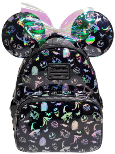 Go on your journey's in Holographic style! This matching set of the Holographic Nightmare Before Christmas print includes Minnie Mouse ears, mini backpack and wallet both by Loungefly!
