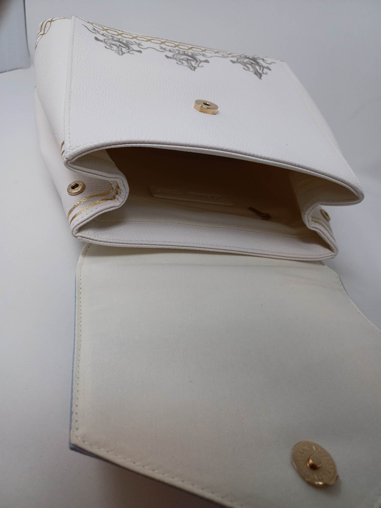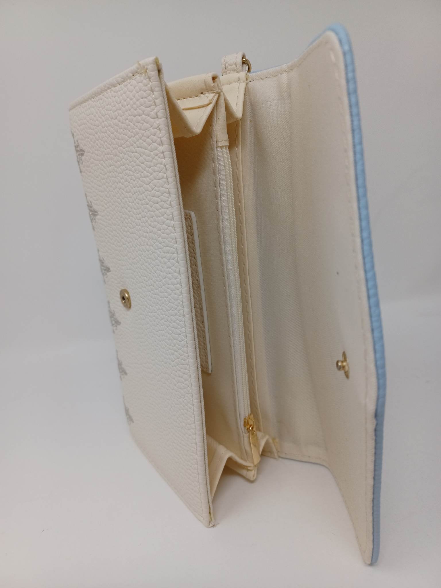 The wallet uses a snap closure, with several interior pockets, and a zippered coin pouch area. It also has a clip-on wrist strap attached to a gold color finish ring.