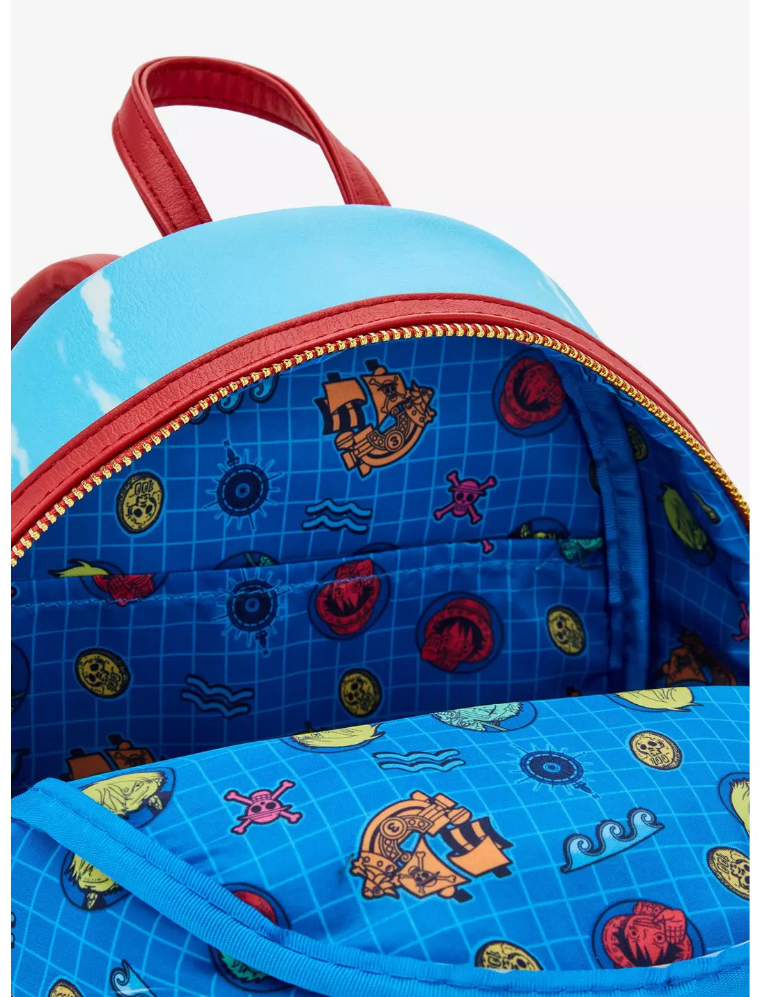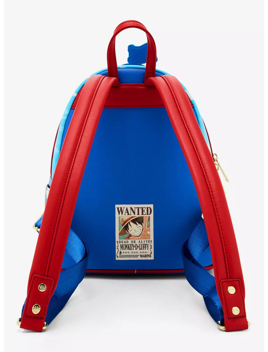 Set sail in style with this One Piece mini backpack! Featuring appliques of Luffy, Zoro, and Sanji, the front pocket includes a design of the Thousand Sunny. With a Jolly Roger zipper pull, this backpack is meant for swashbucklers.