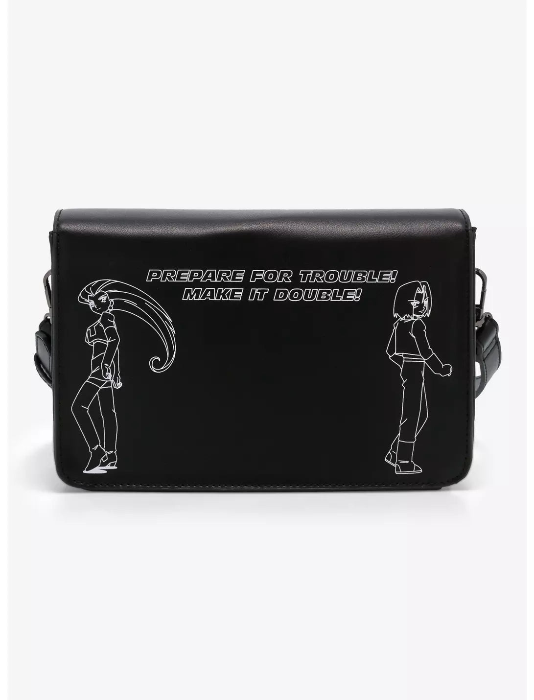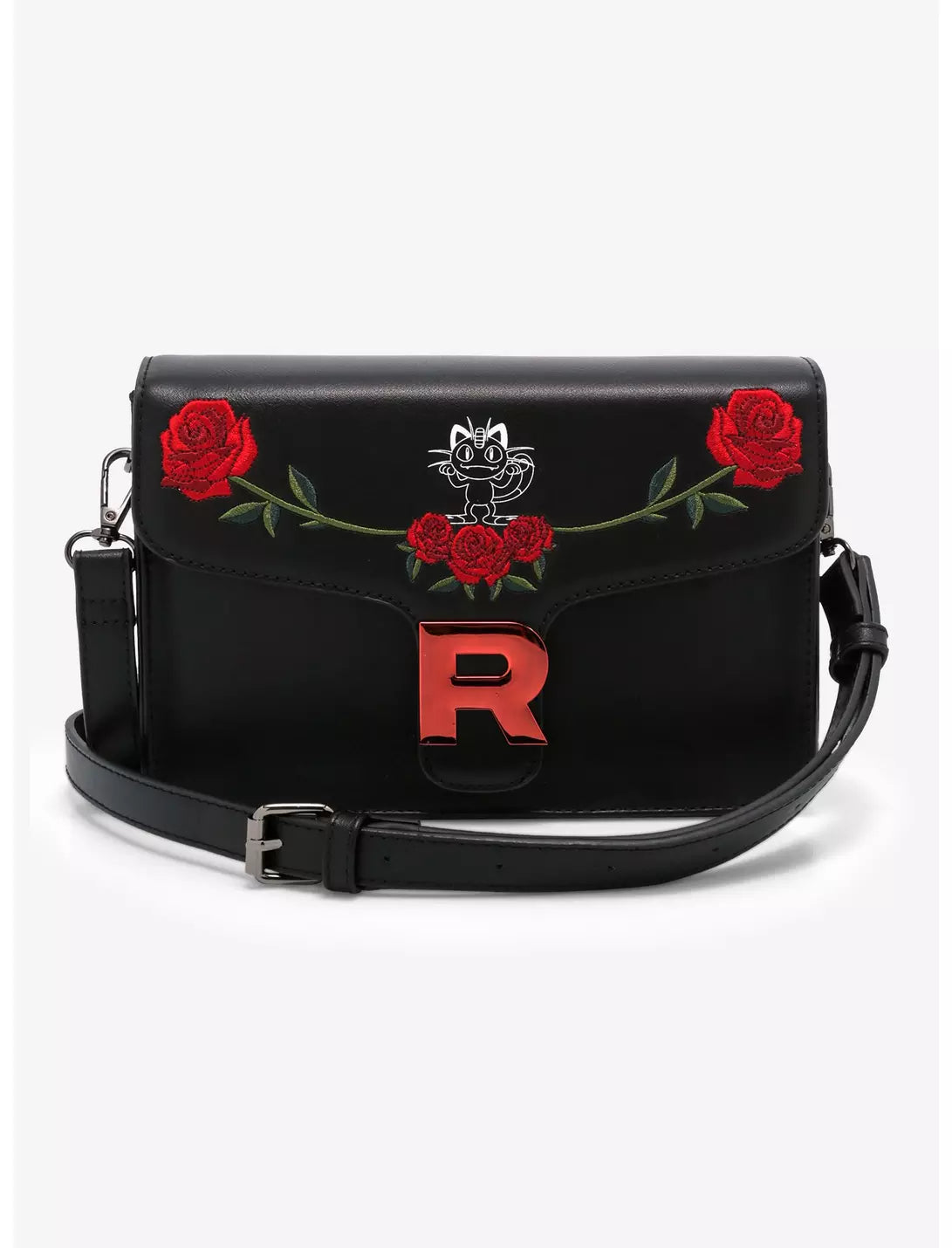 Prepare for trouble with this Pokémon-inspired bag! While the front features embroidered roses, a portrait of Meowth, and a metal "R" plaque on the closure, the back includes portraits of Jessie and James. With a removable crossbody strap, this purse is perfect for adding to your training essentials.