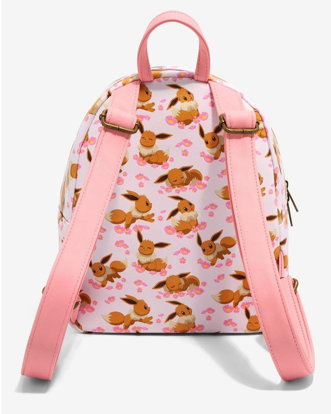 Take a break from gym battle training and spend some time enjoying the outdoors with your favorite Pokémon! This super cute pink mini backpack features an allover print of Eevee enjoying their time among blooming sakura flowers. Comes with adjustable straps, front zipper pocket, interior drop pocket and a top carrying handle.