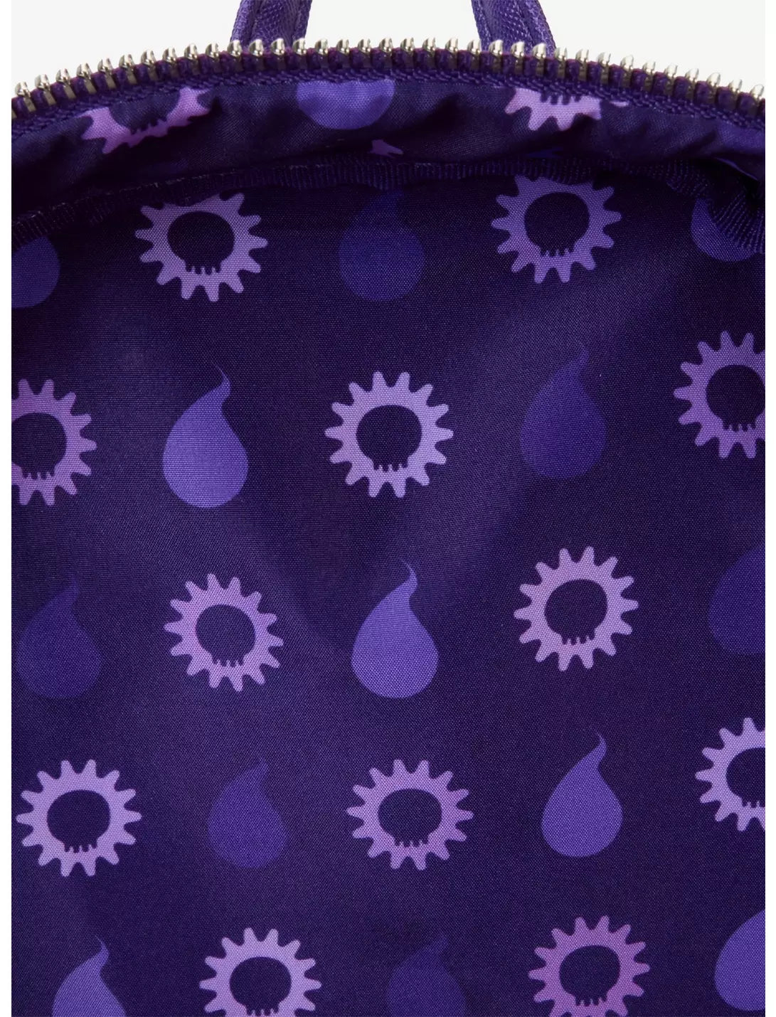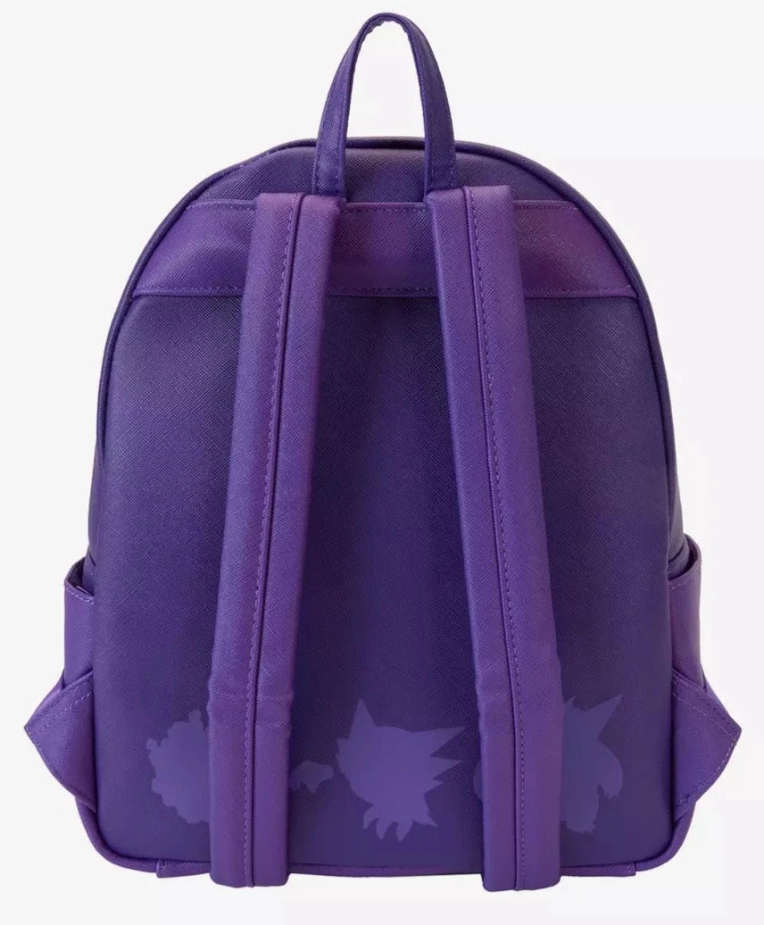 The Loungefly Pokemon Ghastly Evolutions Triple Pocket Mini Backpack is made of vegan leather (polyurethane). Bag has adjustable shoulder straps and sturdy metal hardware. Additional features include applique, debossed, and printed details. Take note of the coordinating inside lining.