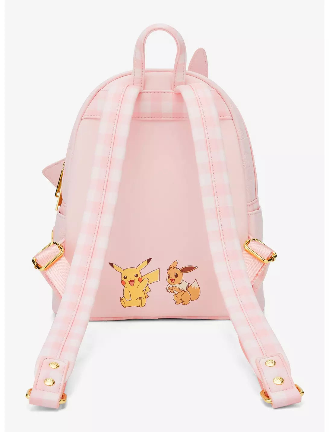 Pack your Poke Balls, berries, potions and more in this pink, Pokemon mini backpack! Featuring appliqué detailing on the front of a happy Pikachu and Eevee. The body of the bag features yummy snacks debossed all over. Comes adjustable straps, interior drop pocket and front zipper pocket.