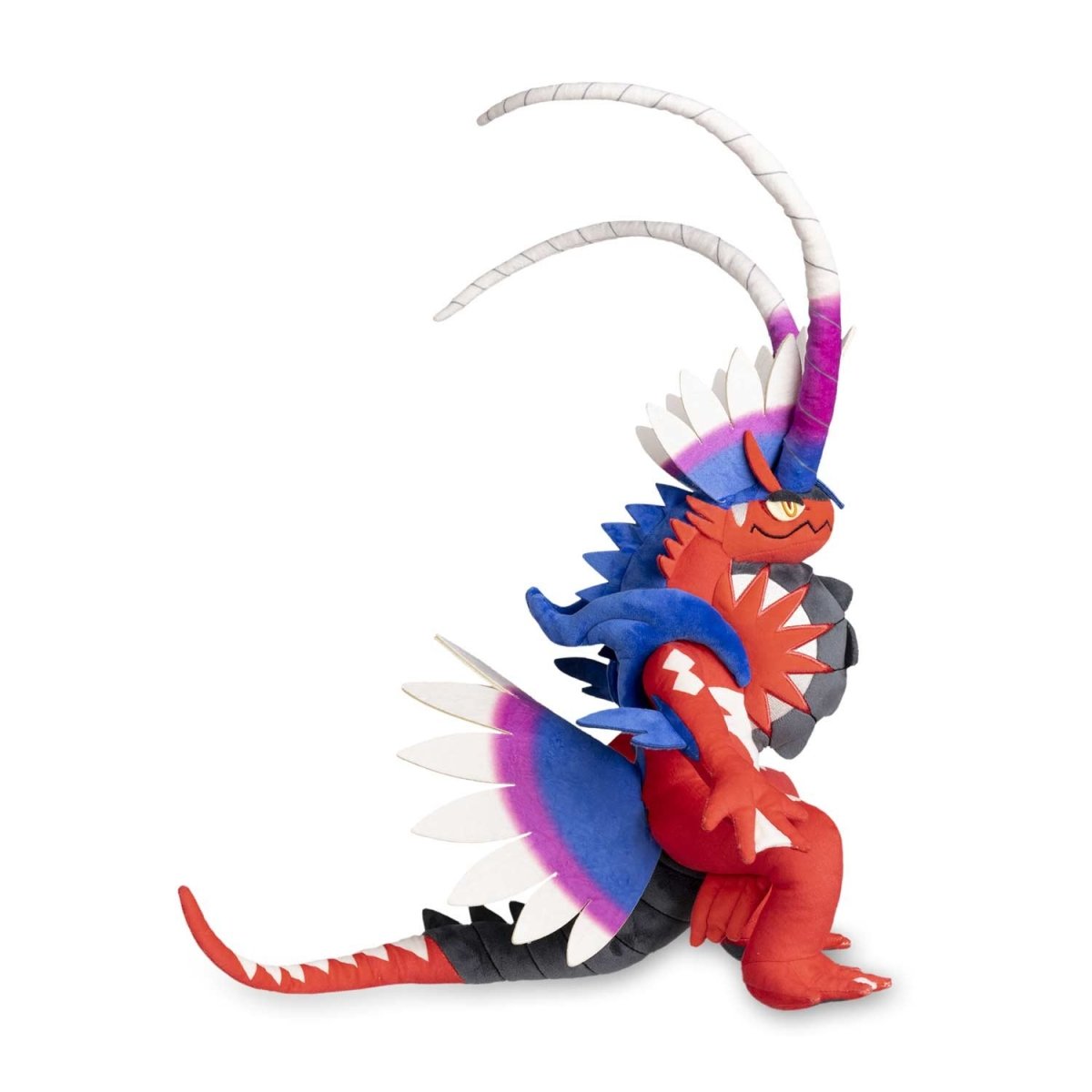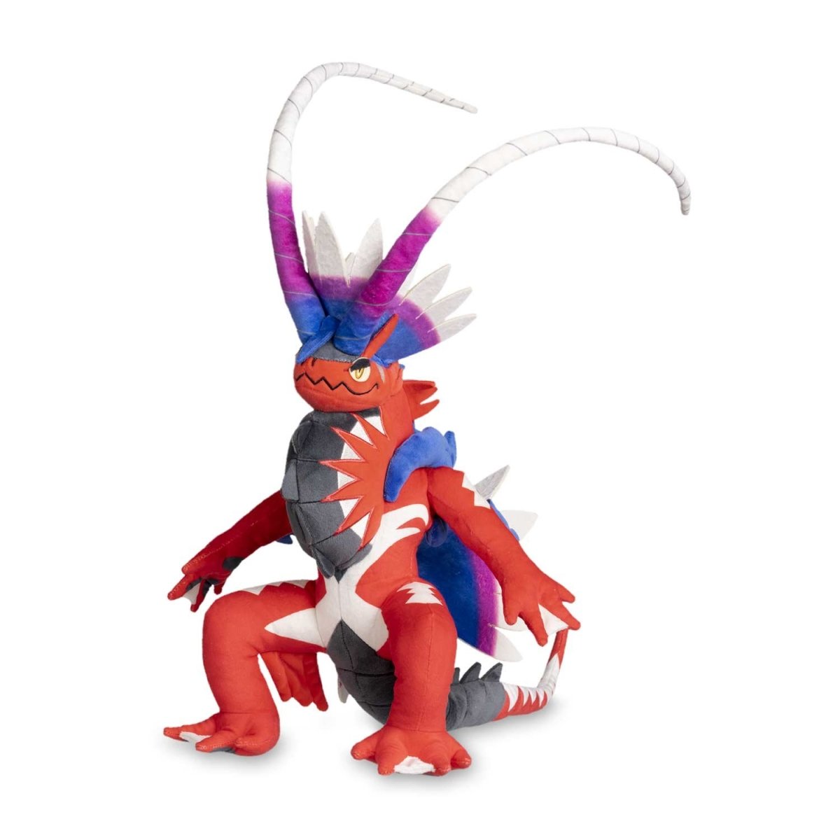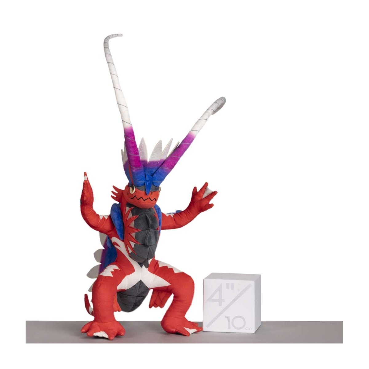 The Paradox Pokemon Koraidon has appeared as a cuddly Poke Plush with embroidered facial features, foam spikes, horn, and tail, plus a vibrantly colored body! In the Pokemon Scarlet video game, Koraidon shows its strength and gives the player rides all throughout the Paldea region. This Poke Plush version, however, will do better displayed on a couch, shelf, or coffee table.