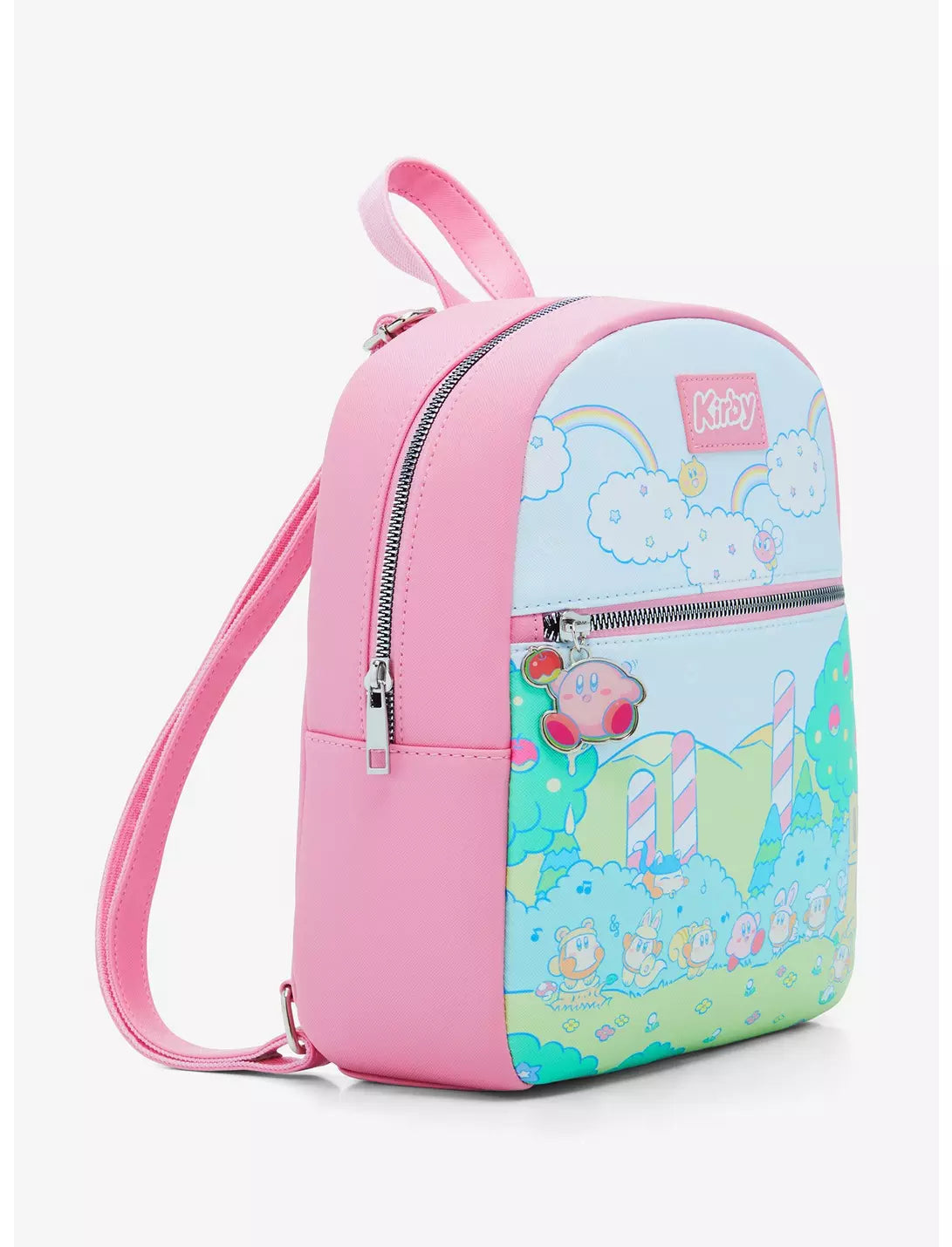 Kirby and his pals are ready for a springtime stroll! This pastel mini backpack shows a super cute scene of Kirby and multiple Waddle Dees wearing springtime creature outfits. There's a zipper charm showing Kirby holding an apple. There's also a front pocket and adjustable straps.
