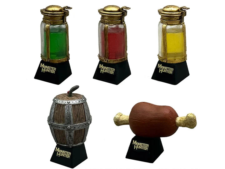 Whether you're in need of a stamina boost, health buff, or simply a quick snack, this selection of desk trinkets has got you covered. Collect Demondrug, Potion, Energy Drink, Bomb Barrel, and of course, some well-done meat. There's a mystery 6th possible item to find as well!