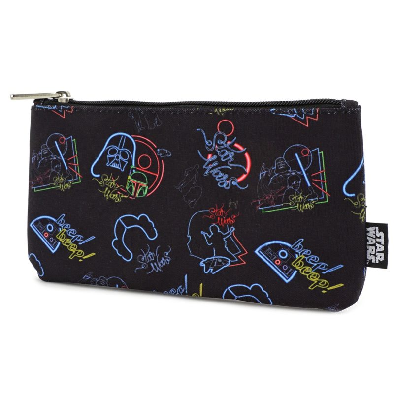 This fun black nylon zipper pouch has a repeating all-over print of assorted Star Wars designs, with a fun colourful neon sign style. The designs include Princess Leia, Darth Vader, R2-D2, and Han Solo.