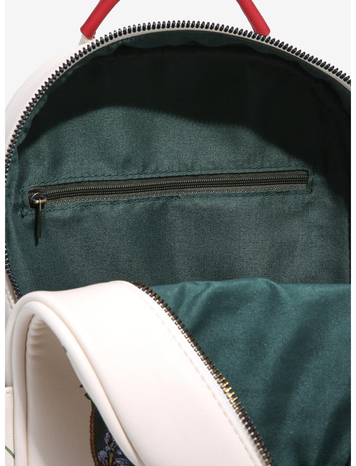 The fierce Princess of the Wolf Gods, San, and Ashitaka come together on the front of this stunning mini backpack! Capturing an iconic moment between the two straight from the scenes of Princess Mononoke, the anime duo are seen in a botanical circle frame amongst animals and nature. With an enamel Princess Mononoke badge on the top, the front of this style also dons adorable forest spirits above the exterior zippered pocket.