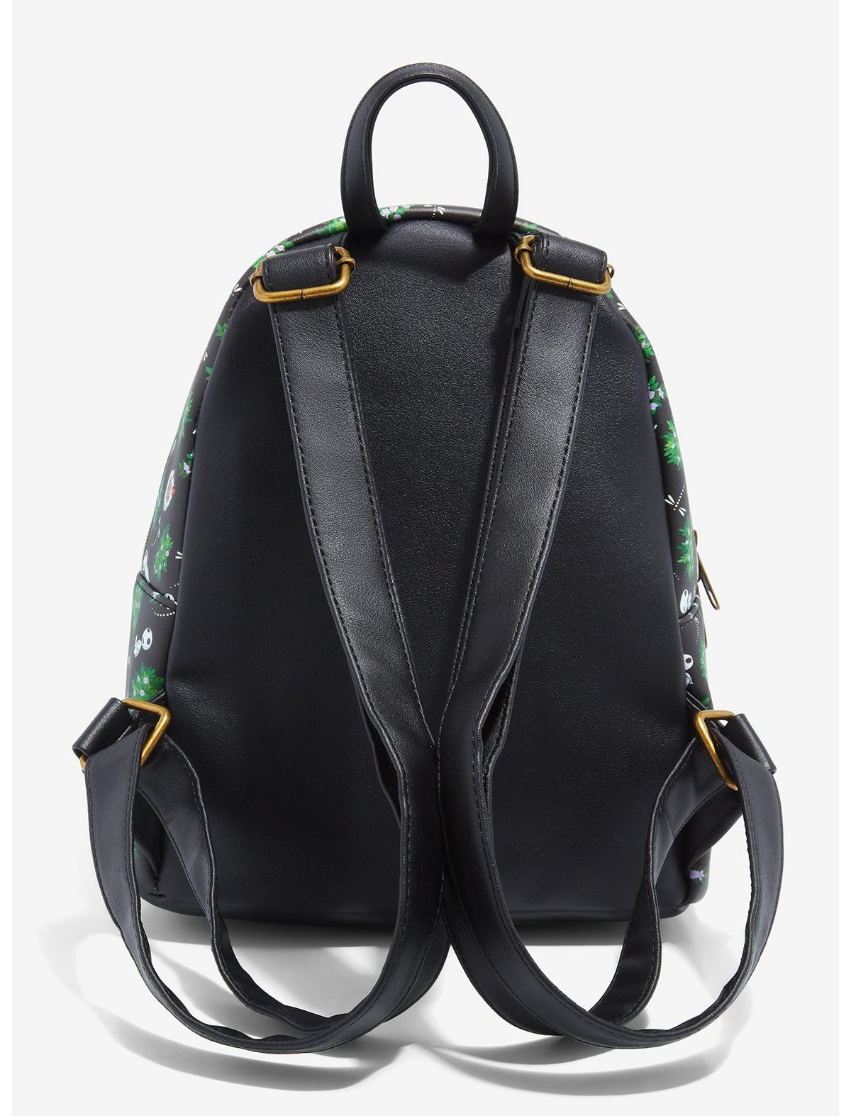 Pack all of your essentials for your journey with Ashitaka! This Princess Mononoke mini backpack features a toss pattern of forest spirits and lavender foliage. Adjustable straps, front zipper pocket, interior drop pocket, top carrying handle and antique brass tone hardware.