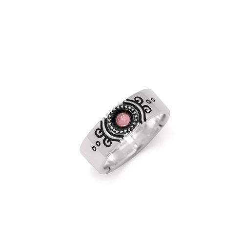 The main body is made of 925 silver, and the characteristic patterns are carved and then oxidized. The gemstone part is made of synthetic pink tourmaline.