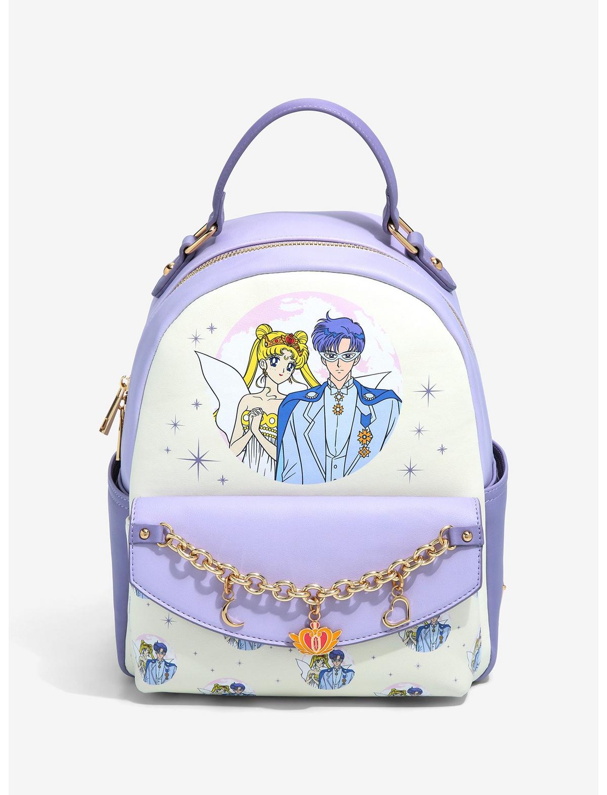 Take a bit of Moon Kingdom style with you on all of your travels with this Pretty Guardian Sailor Moon mini backpack! Inspired by the beloved anime series, this bag features a front portrait graphic of Neo Queen Serenity and King Endymion on the front, decorated by a gold-toned chain with charms of a crescent moon, the Spiral Heart Moon Rod, and a heart. Also features two side pockets, an enamel brand badge, adjustable shoulder straps, and an icon interior lining pattern.