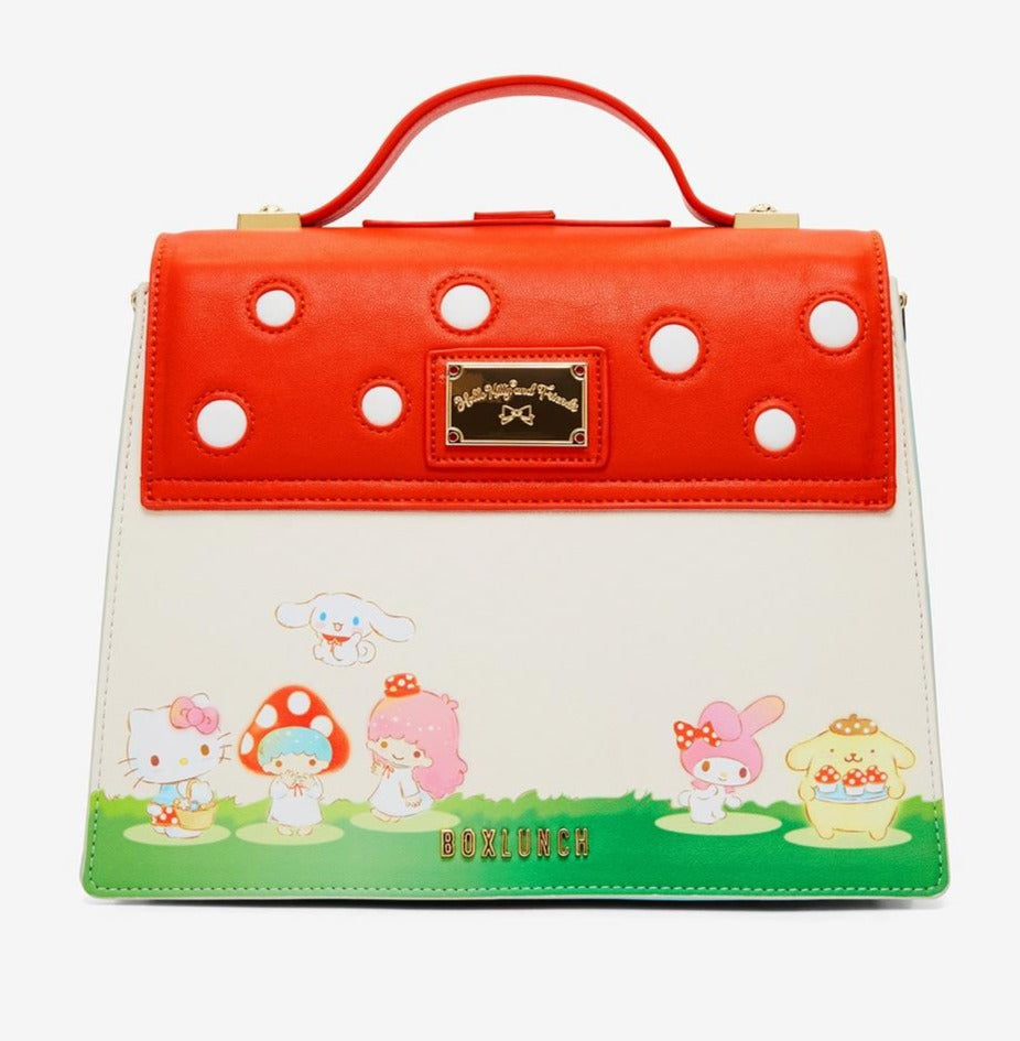 Carry your essentials in Sanrio style with this crossbody bag! Featuring mushroom decals and a magnetic mushroom house pocket on the front, this bag includes two magnetic flap closures with beaded floral details and Hello Kitty and My Melody window decals. With a top handle and a removable crossbody strap, this bag is perfect for adding some fungi fashion to any look.