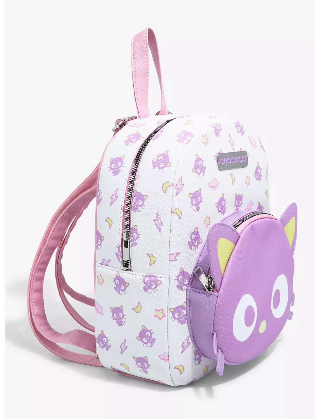 Rep your favorite Sanrio kitty, Chococat, with this pastel mini backpack! The front pocket is figural and made to look like Chococat, and the rest of the backpack has an allover print of Chococat and celestial symbols. Interior pocket and adjustable straps.