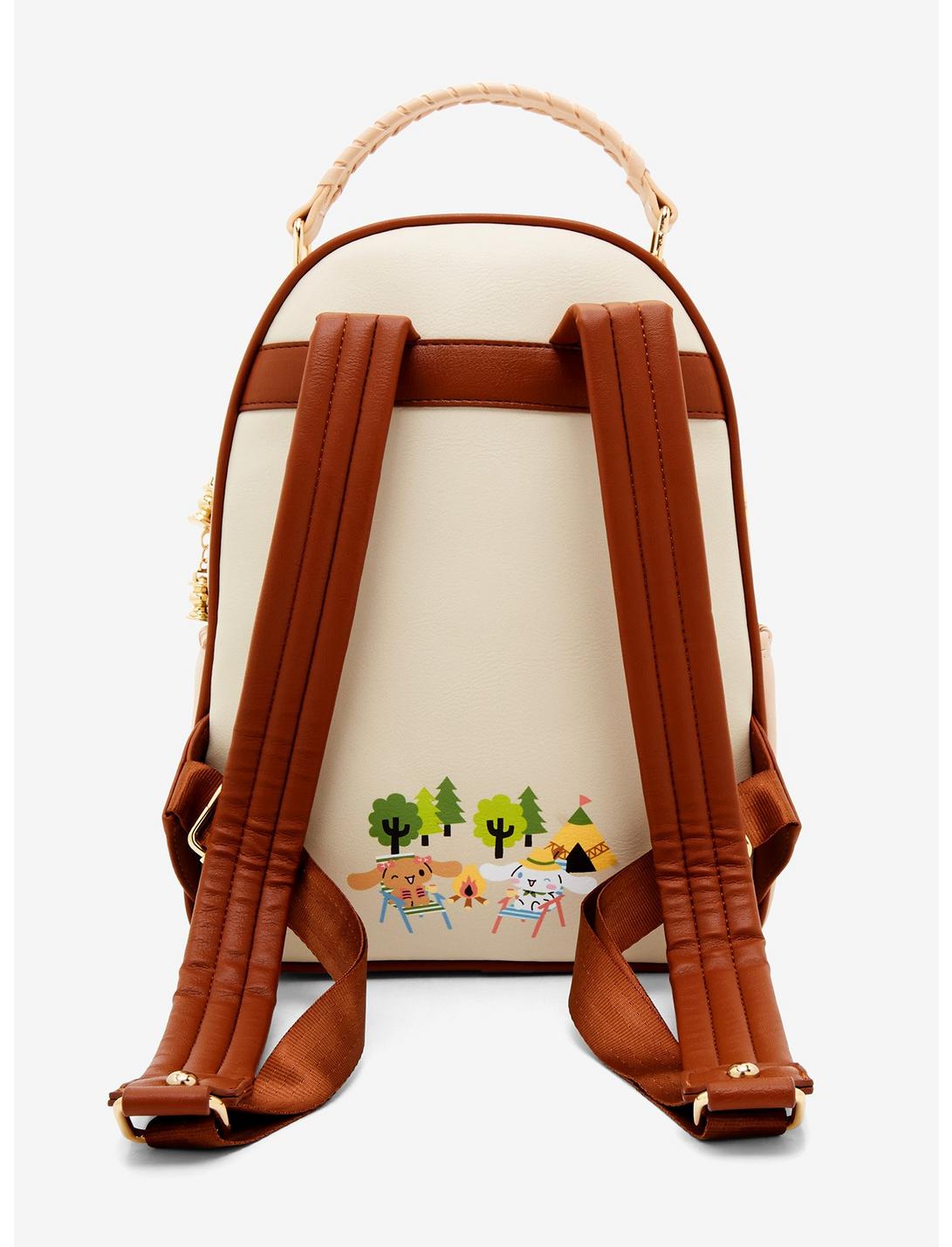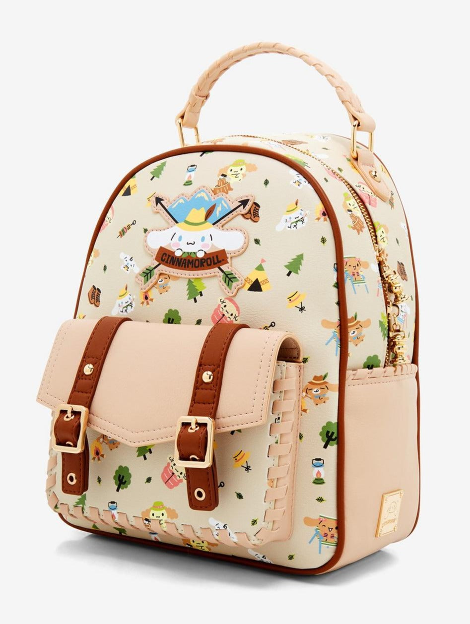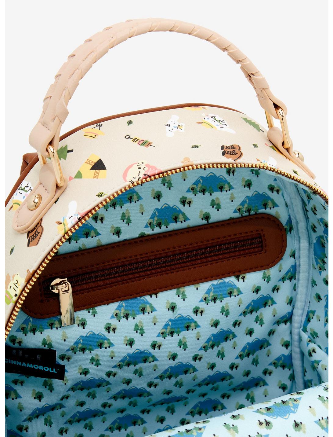 Get ready to go camping with Cinnamoroll and friends with this Sanrio mini backpack! Featuring an allover print of the little white dog and his friends from the Cinnamoroll Camping collection, this bag has a braided top handle, metal lantern zipper charms, and a front pocket. The front pocket has a snap closure with faux buckle straps and braided details to make storing your essentials simple.