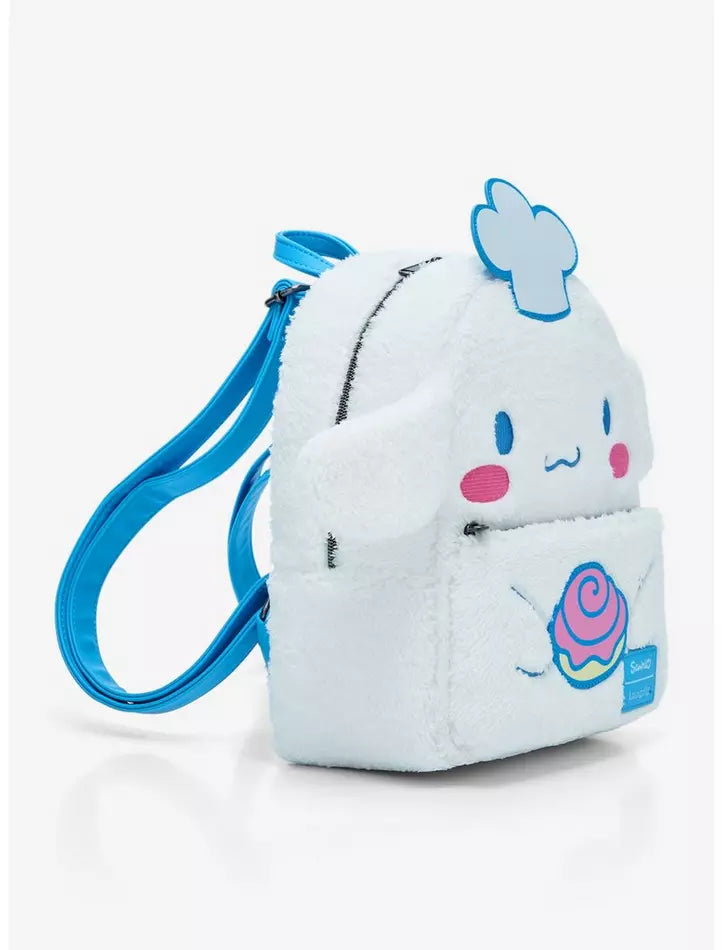 Head to the bakery with the perfect mini backpack on! This Sanrio backpack has a fluffy exterior with Cinnamoroll's face up top and his hands holding a cinnamon roll on the front zipper pocket. Complete with 3D ears, chef's hat, and interior drop pocket.