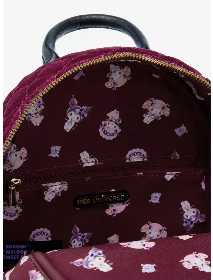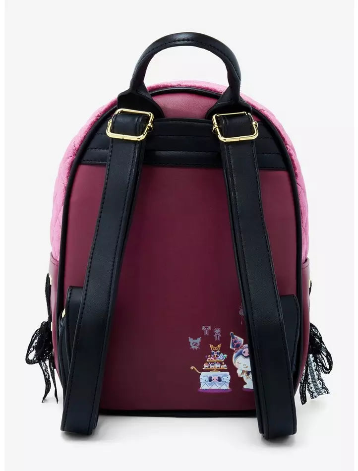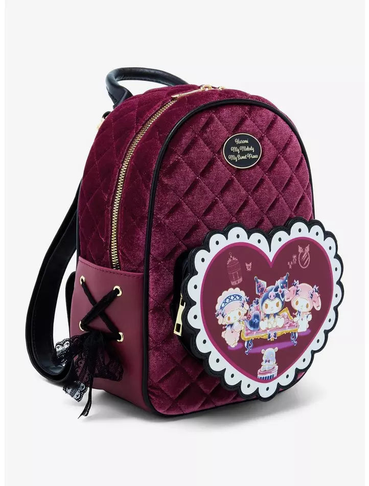 Having a cute party with your Sanrio besties? Pack all of your essentials in this luxurious mini backpack. It has a quilted velvet design, with a heart appliqué on the front pocket depicting My Melody, Kuromi and My Sweet Piano having a cute party. Comes with adjustable straps, interior zipper pocket and black lace detailing on the sides.