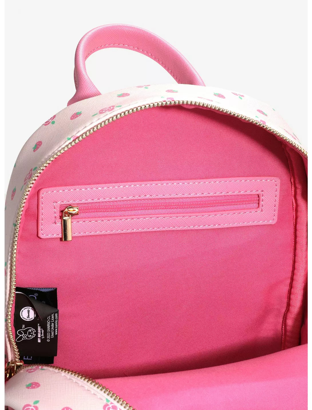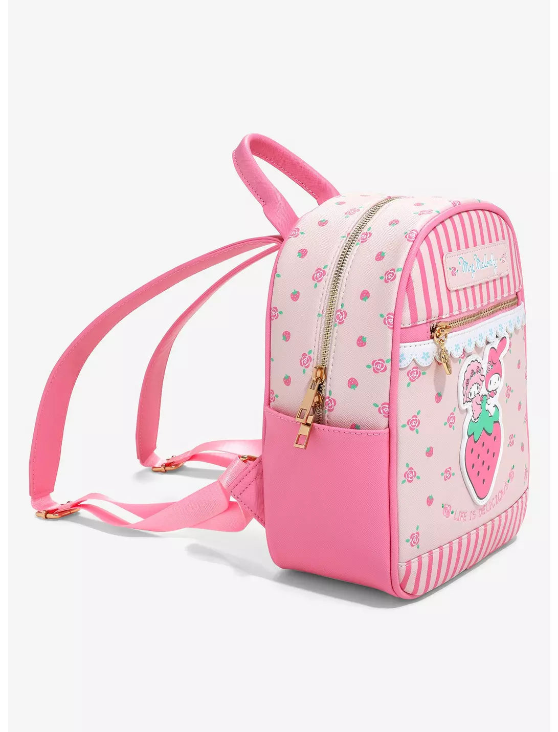 Spruce up your look with sweet Sanrio style! This pastel pink backpack features an applique of My Melody and My Sweet Piano atop a strawberry, just above embroidered "Life is Delicious" lettering. With a strawberry zipper pull, embossed details, and scalloped edges, this bag keeps your valuables safe and chic!