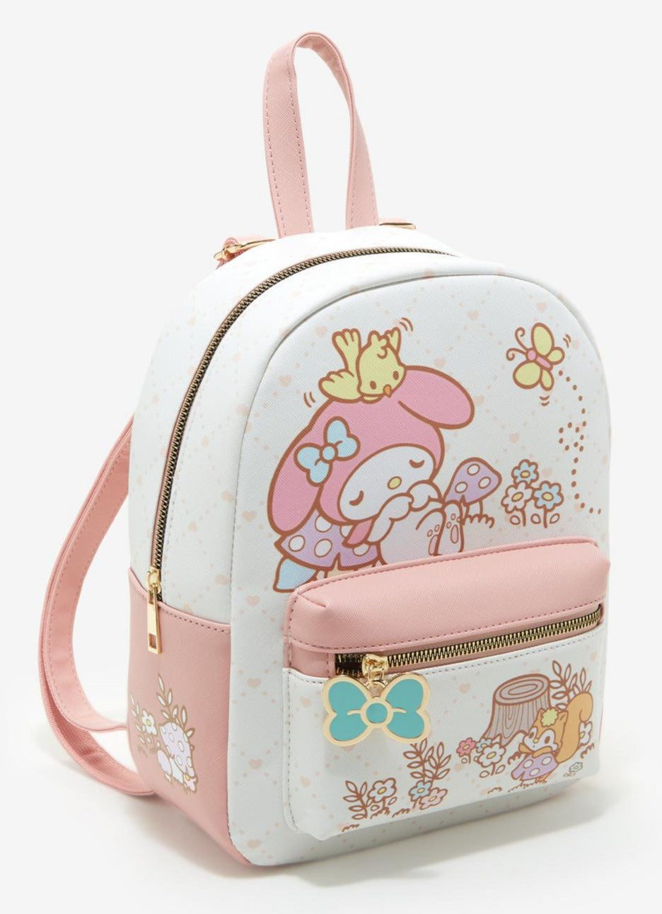 Relax in the forest with your Sanrio bestie! Pack all of your essentials for a day of fun with this mini backpack, featuring a forest scene of My Melody taking a nap among her forest friends. Front zipper pocket comes with a charm of her signature blue bow. Comes with interior drop pocket and adjustable straps.