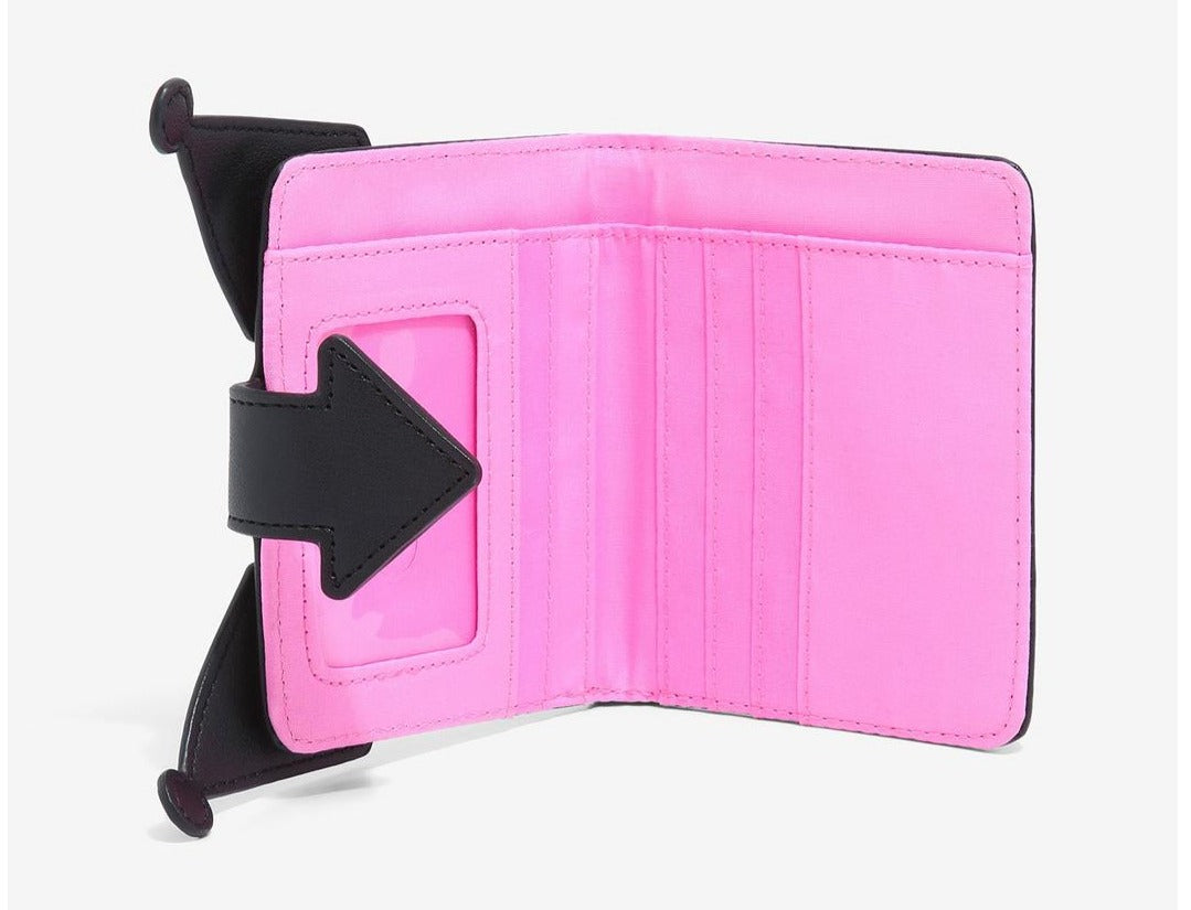 Kuromi wouldn't dare let anyone cop your cash! Keep your dough and your ID safe with this Loungefly Kuromi character wallet. Features embroidered details of Kuromi's jester ears, 6 card slots, billfold and snap-button closure. Light pink interior lining.