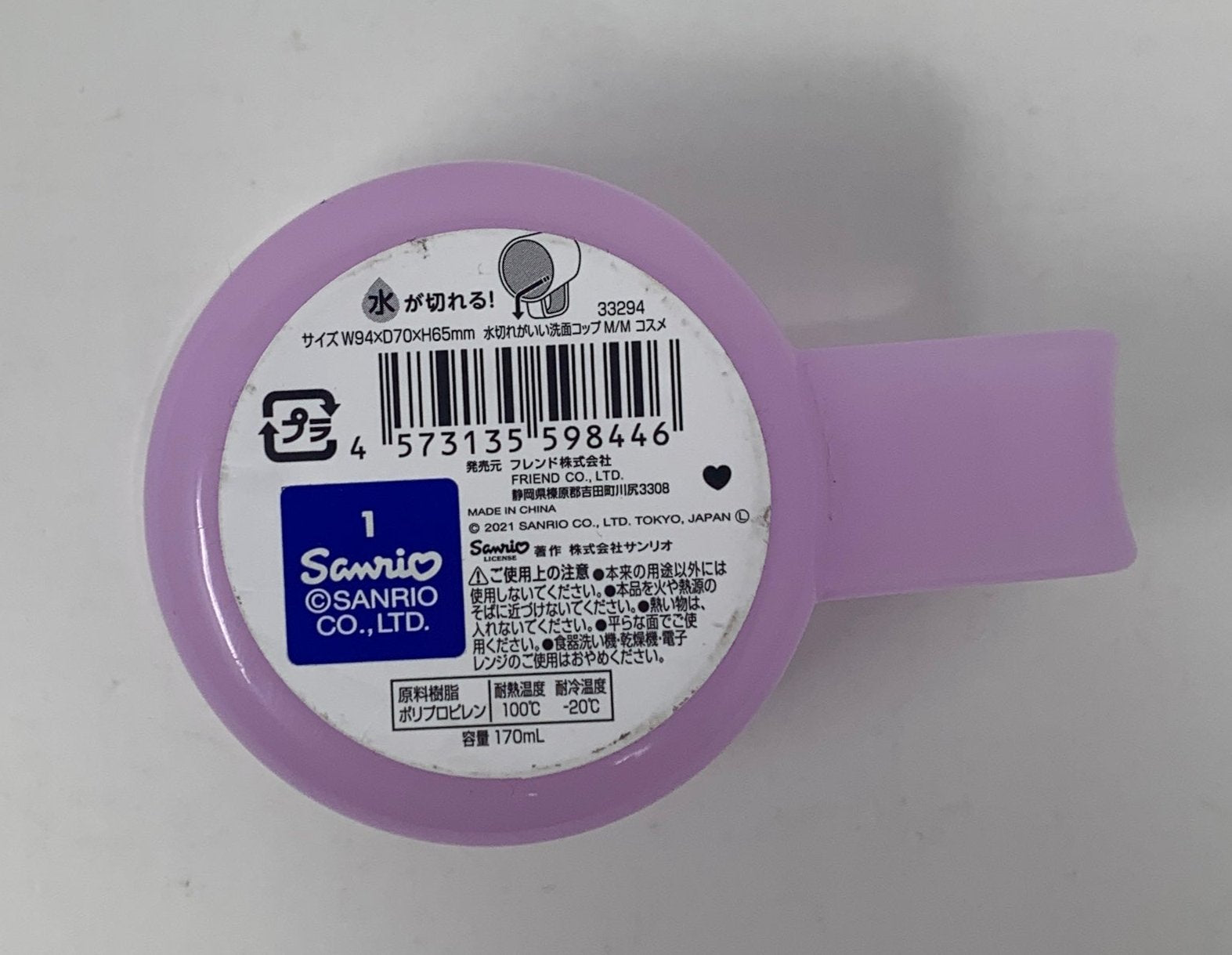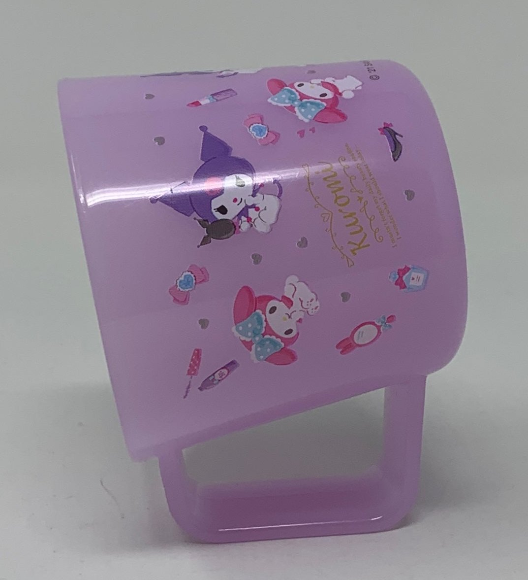 This washing cup features a print of My Melody and Kuromi getting ready for the day surrounded by makeup and accessories. This cup also features a tilted handle, when placed on the handle, the cup tilts forward to help it air dry as a hygienic alternative to placing it upside down on a towel.