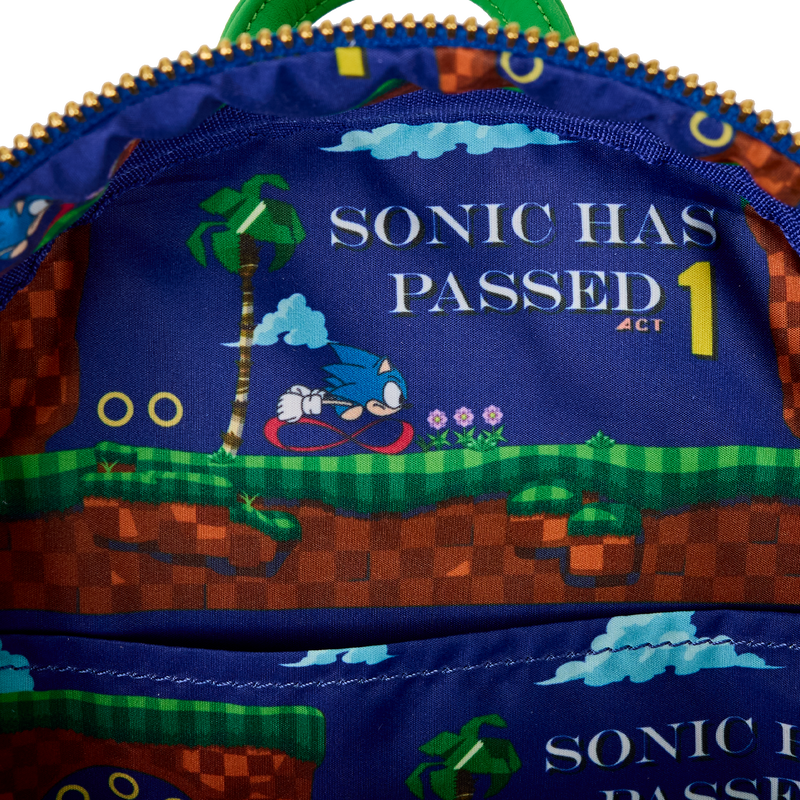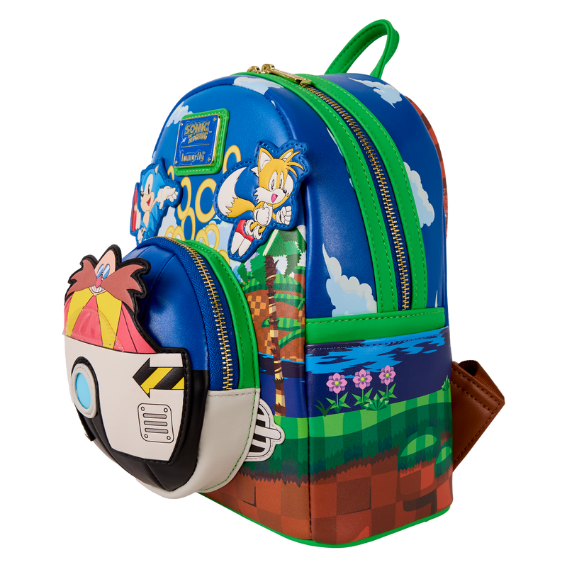 This mini backpack celebrates all things Sonic. The 3D front pocket features Doctor Eggman (aka Doctor Ivo Robotnik). The front of his ship lights up! Above him, you'll find Sonic and Tails. Rings float behind them, and the rest of the bag is covered in a pixelated landscape reminiscent of the game.
