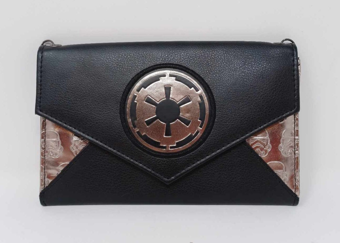 Faux leather, w/ two silver contrasting panels embossed w/ a repeating stormtrooper helmet design. The front flap features an embossed Imperial ‘cog’ symbol appliqué & closes w/ a standard button dome clasp. Lined inside w/ black fabric, w/ 6 card slots & one bill slot. The back has an open pocket, which is also lined in black fabric. When closed it measures approximately 6 x 4 x 1 inches