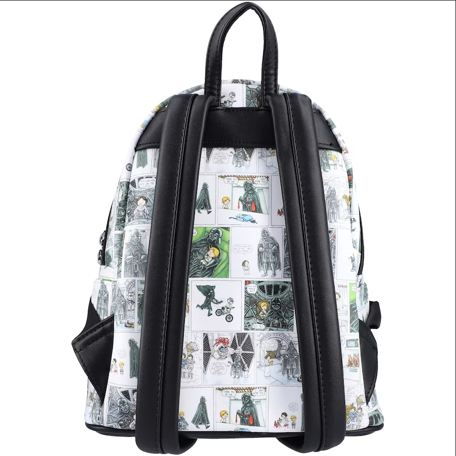 Embrace the galactic responsibility of parenthood by transporting items in this Star Wars mini backpack from Loungefly. The comic-strip style artwork by Jeffery Brown features funny, endearing depictions of Darth Vader as a loving father facing the daily challenge of raising young Luke and Leia before they become two of the galaxy's finest heroes. This uplifting Star Wars backpack has plenty of room to store everyday essentials and fond family memories.