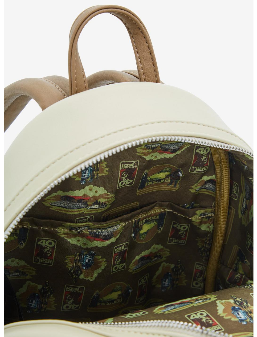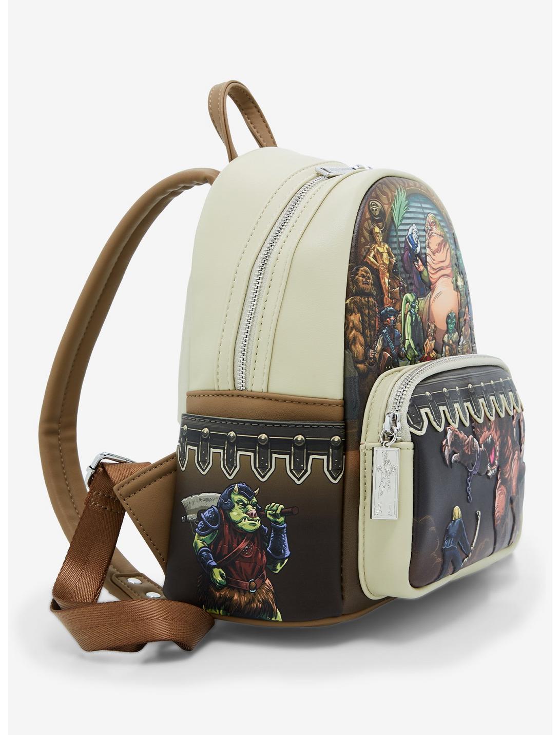 Celebrate the 40th anniversary of Return of the Jedi with this Loungefly mini backpack! Featuring a portrait of Jabba's palace scene with embossed details on the front, and a design of Luke Skywalker in the Rancor pit on the front zipper pocket, this backpack also has a portrait of Max Rebo and his bandmates on the back. With side pockets, adjustable straps, and a zipper charm of Han Solo in carbonite, this backpack is perfect for Star Wars fans.