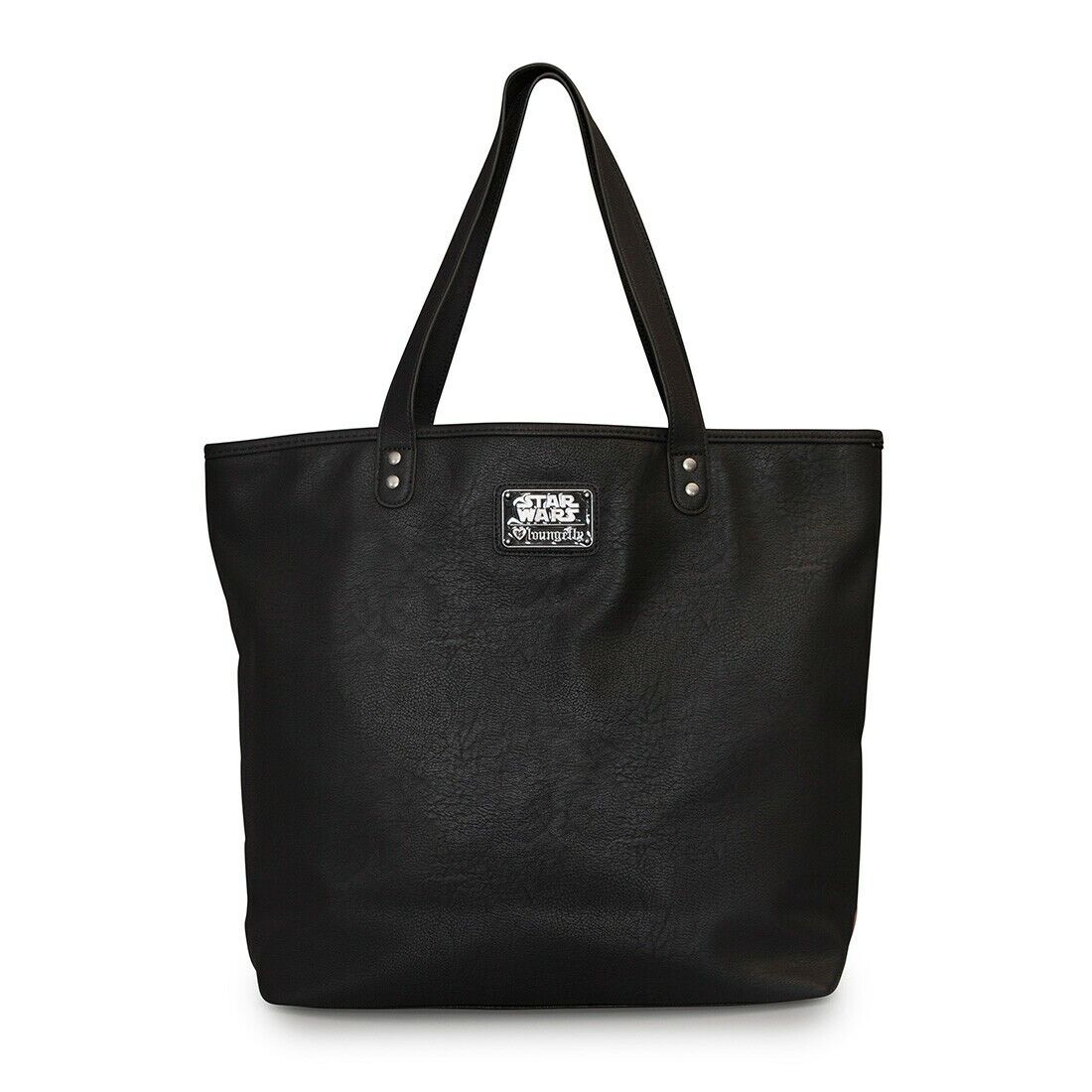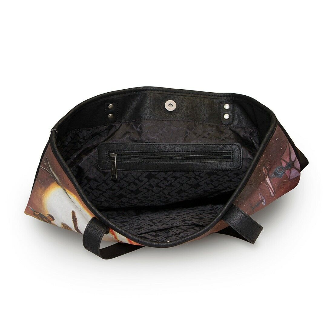 This fun fashion tote features "The Force Awakens" movie poster photo and includes Darth Vader, Rey, Finn, Poe, Chewbacca, R2-D2, C-3PO, BB-8 and the image of a lightsaber going thru the center. Tote has a black "STAR WARS" imprinted lining, interior zip pocket with Loungefly logo pull, interior sleeve pocket, top magnetic closure, simulated leather straps, silver finish hardware, and the Loungefly STAR WARS label plate. The front of the tote features the movie poster photo and the back is solid black with the label plate.