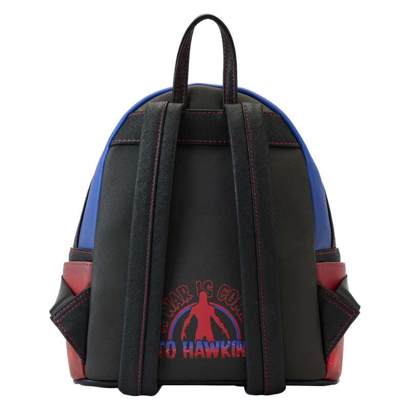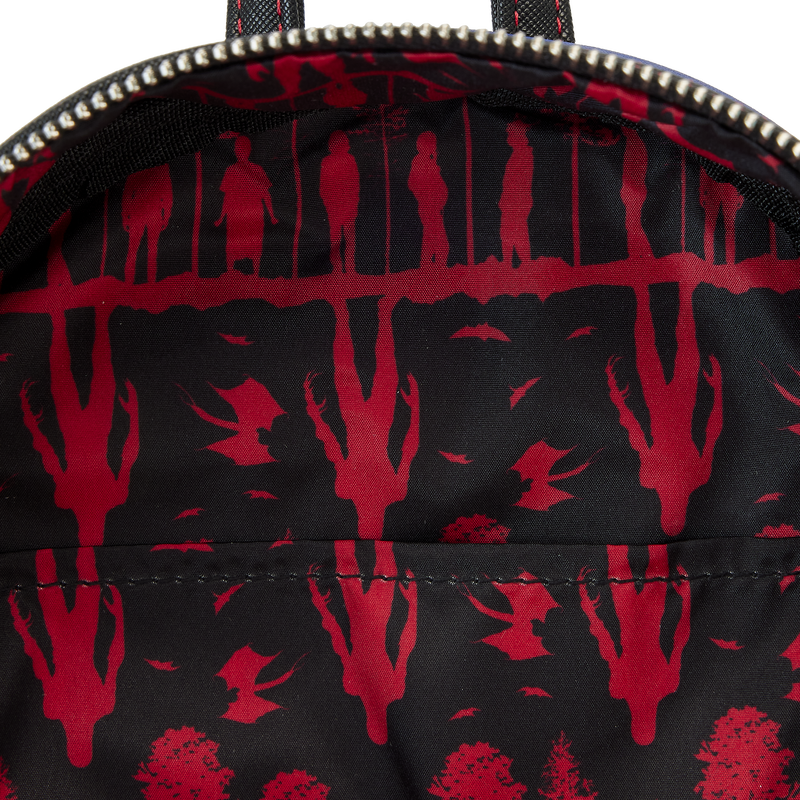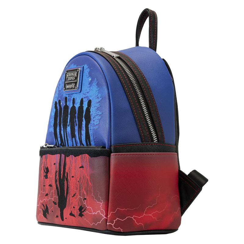 Take on the creatures of The Upside Down in style! Our Loungefly Netflix Stranger Things Upside Down Shadows Mini Backpack is ready for your adventures. This mesmerizing backpack features the shadows of Eleven, Dustin, Lucas, Max, Will, and Mike, as they stand over the edge of The Upside Down. A midnight blue background, with etchings of tree limbs and stars, creates a mysterious and dramatic contrast. On the front pocket, The Upside Down appears in red, with lightning flashes. The shadow of Vecna looms, upside down, along with Demobats, flying through the trees. Claw marks, on one of the side pockets, add a fierce touch. On the back, Vecna’s shadow in red makes an encore appearance, with the following words arcing overhead: “A War is Coming to Hawkins.” Gear up for fun adventures and show off your favorite fandom fashion.