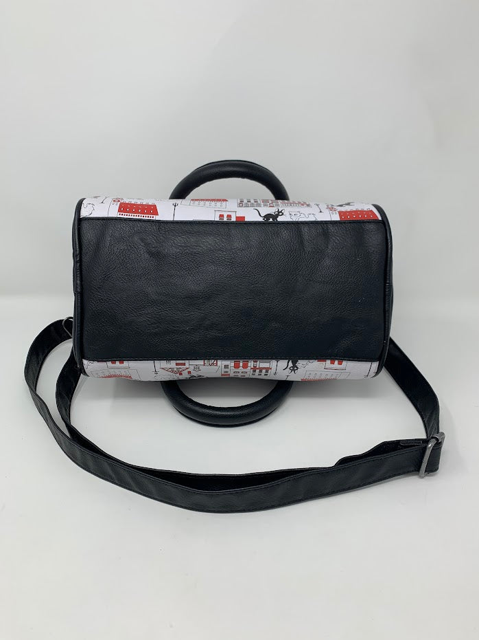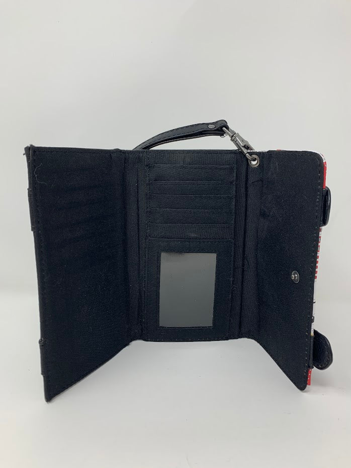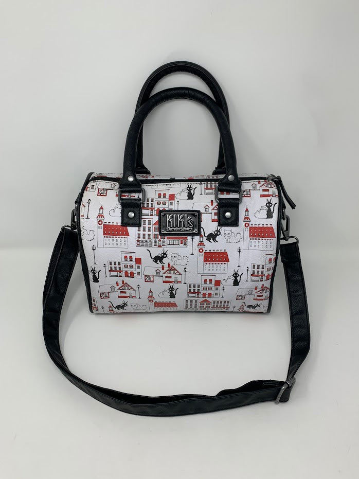 Jiji and Lily hit the town on this Kiki's Delivery Service bag, wallet and bow set from Loungefly and Her Universe. It features a red, white and black print of Jiji, Lily and various buildings.