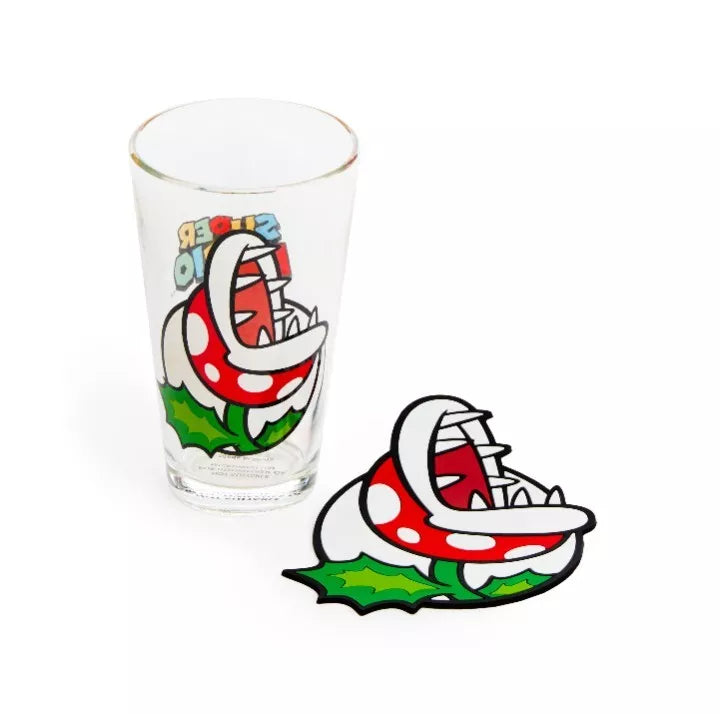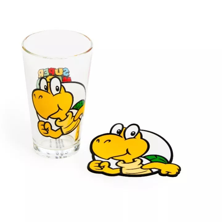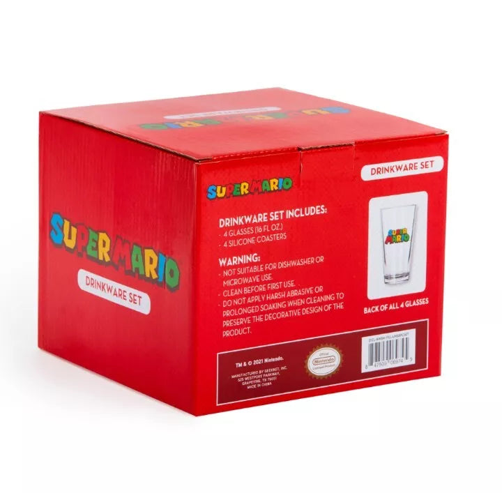 Bring home the action with this Super Mario drinkware set! This set comes with four glasses and matching coasters featuring the classic stage enemies: Koopa Troopa, Goomba, Piranha Plant, and Bullet Bill.