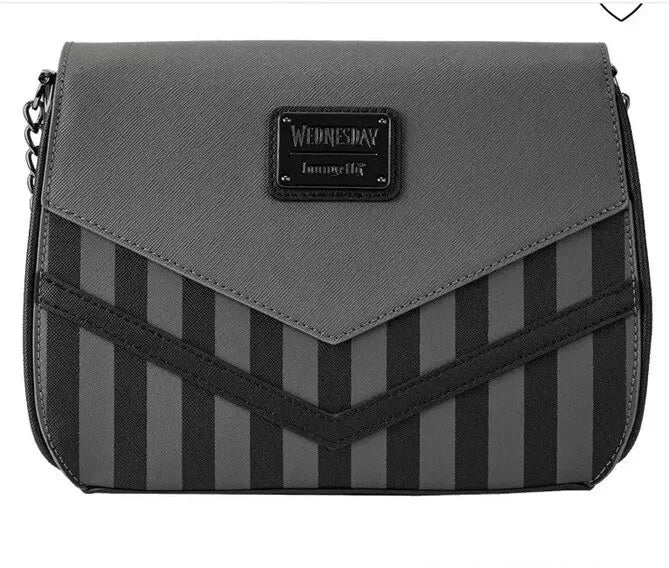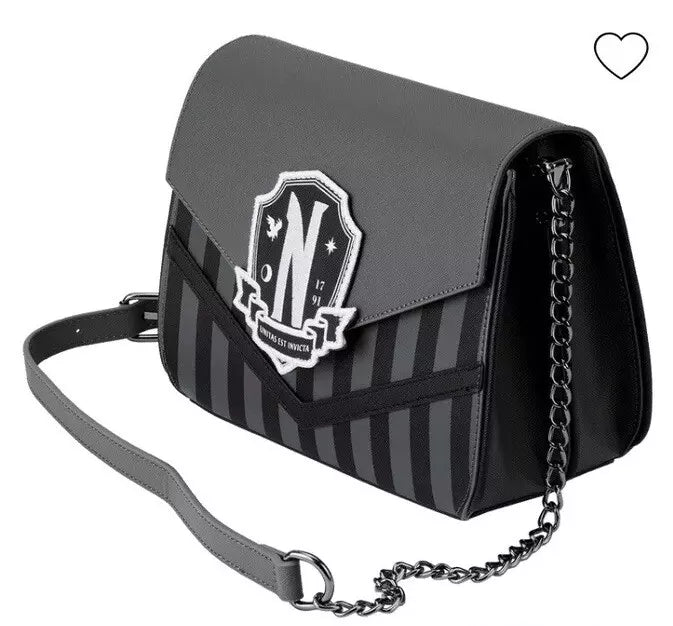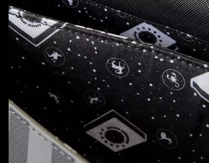 This crossbody from Loungefly commemorates Wednesday Addams' allergy to color using a greyscale color palette to execute the stripped Nevermore Academy uniform and features an embroidered appliqué of the school's crest on the front flap. The interior of the bag features all over print of a book over a starry background with zodiac signs scattered through.