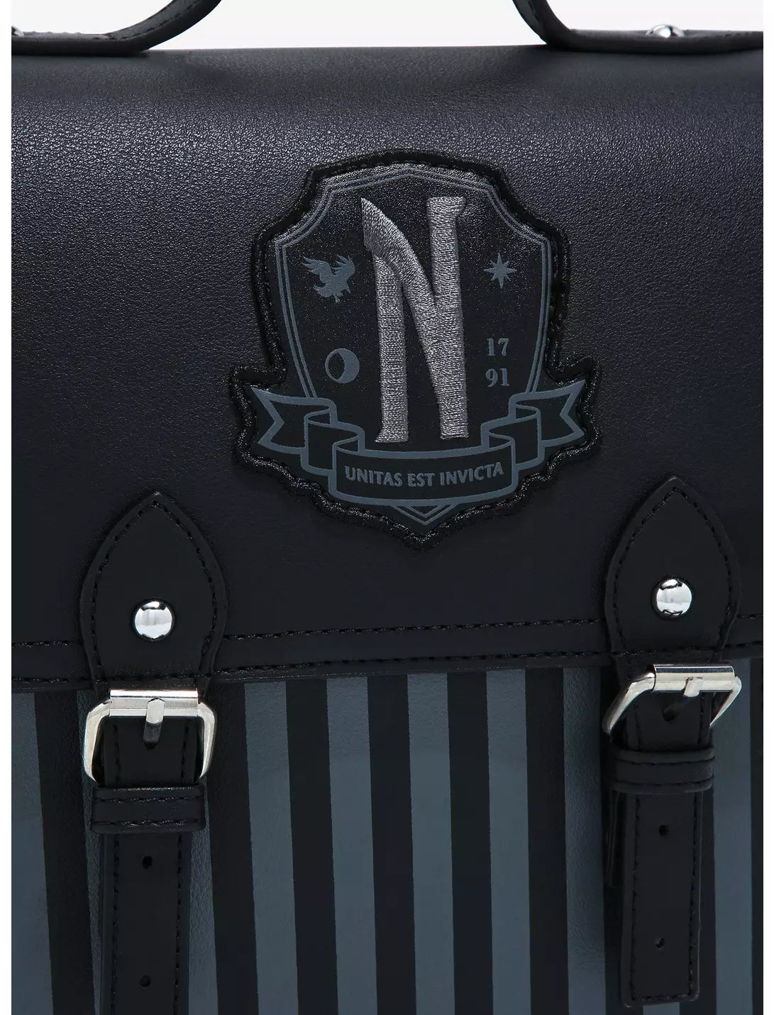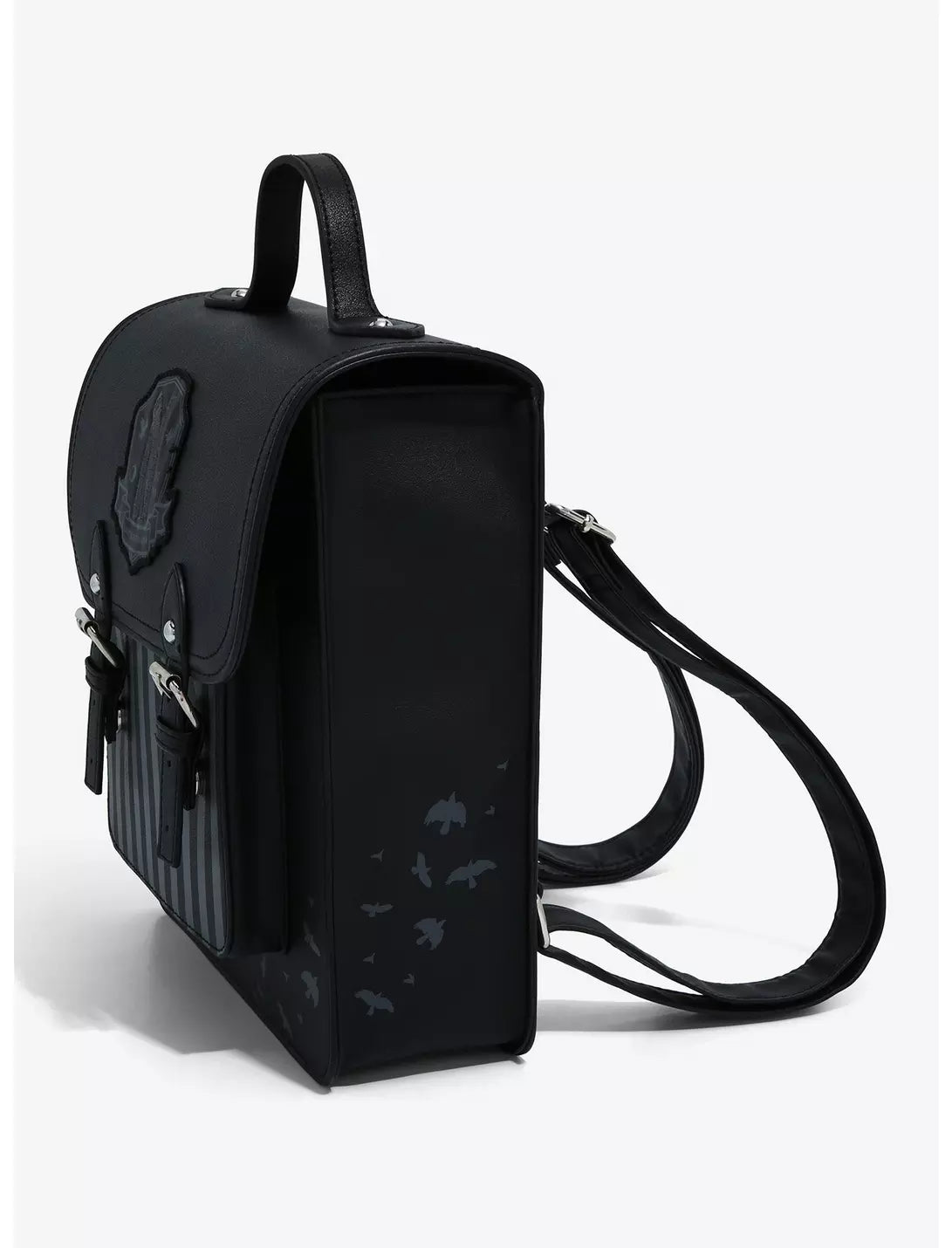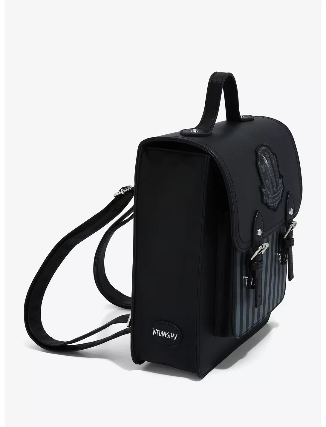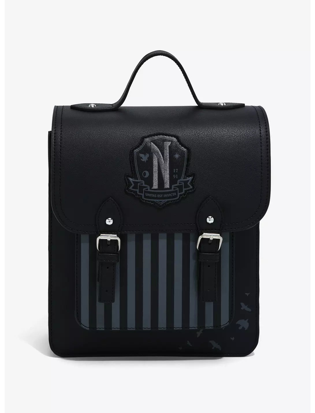 Are you an outcast, freak or monster? Then Nevermore Academy is the place for you! Carry all of your school essentials in this ghoulishly chic mini backpack! From Wednesday, this mini backpack features grey and black stripes, raven silhouettes and an appliqué of the school's crest. Comes with adjustable straps, front pocket, interior drop pocket and a double snap-button closure.