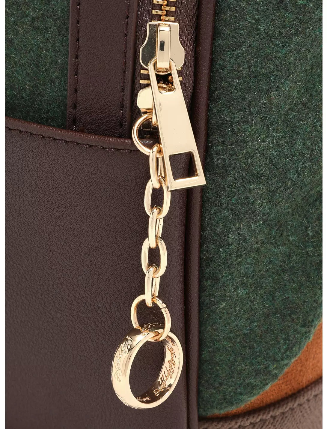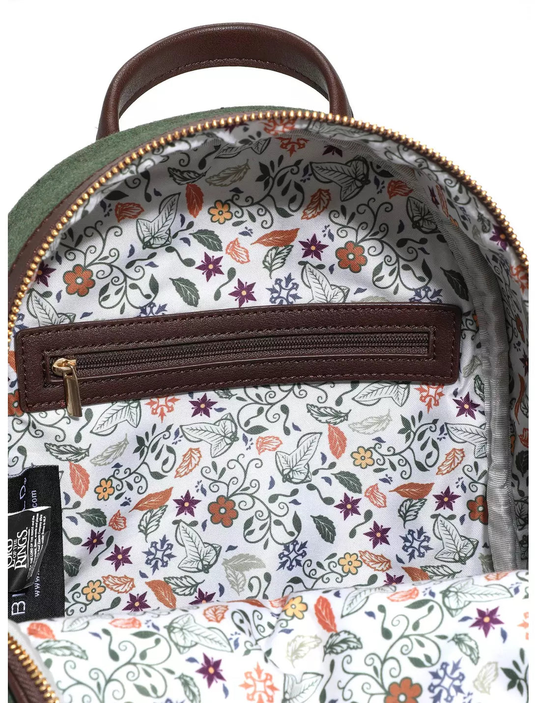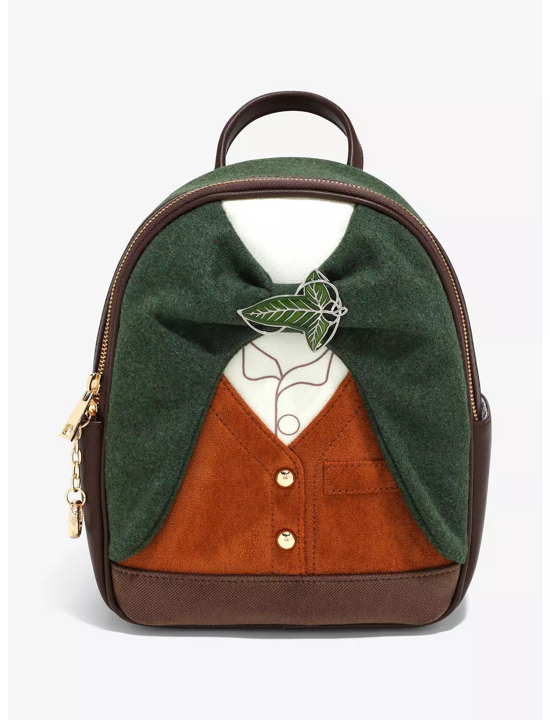Embark as a member of the Fellowship with this Lord of the Rings backpack! As seen in the Peter Jackson's films, this bag's exterior shows off a metal-buttoned, suede hobbit vest and Frodo's felt cloak, a rich green fastened by a gorgeous three-leaf clasp. Inside are lush-leafed patterns reminiscent of Middle-Earth, and don't forget the One Ring on the zipper!