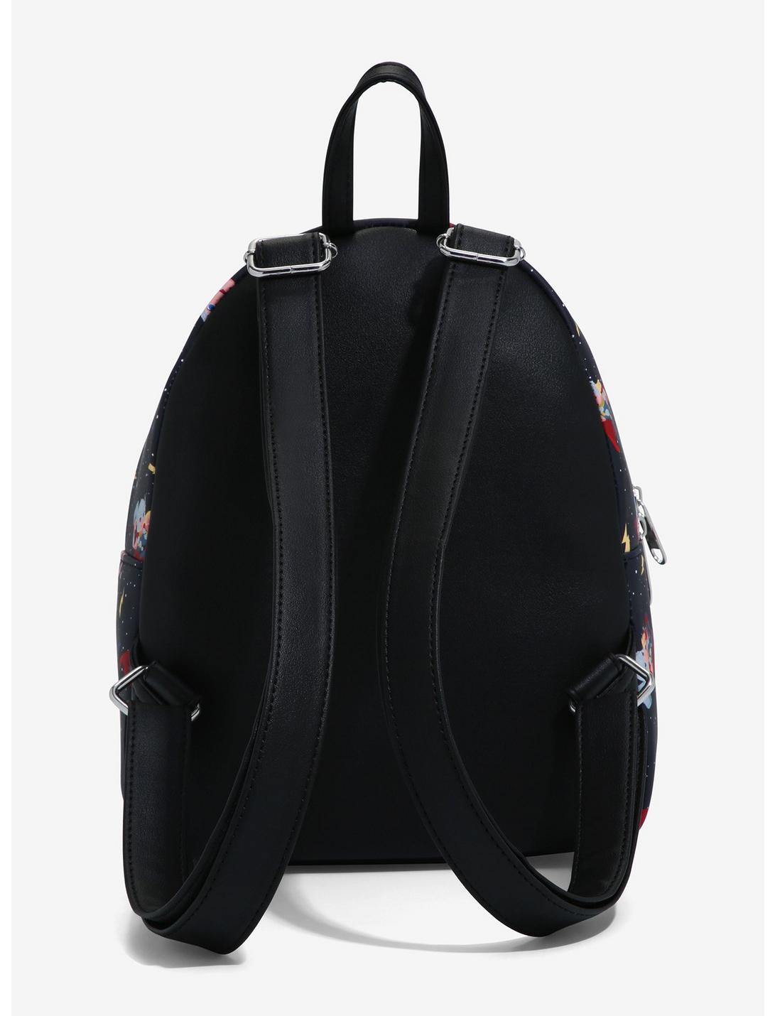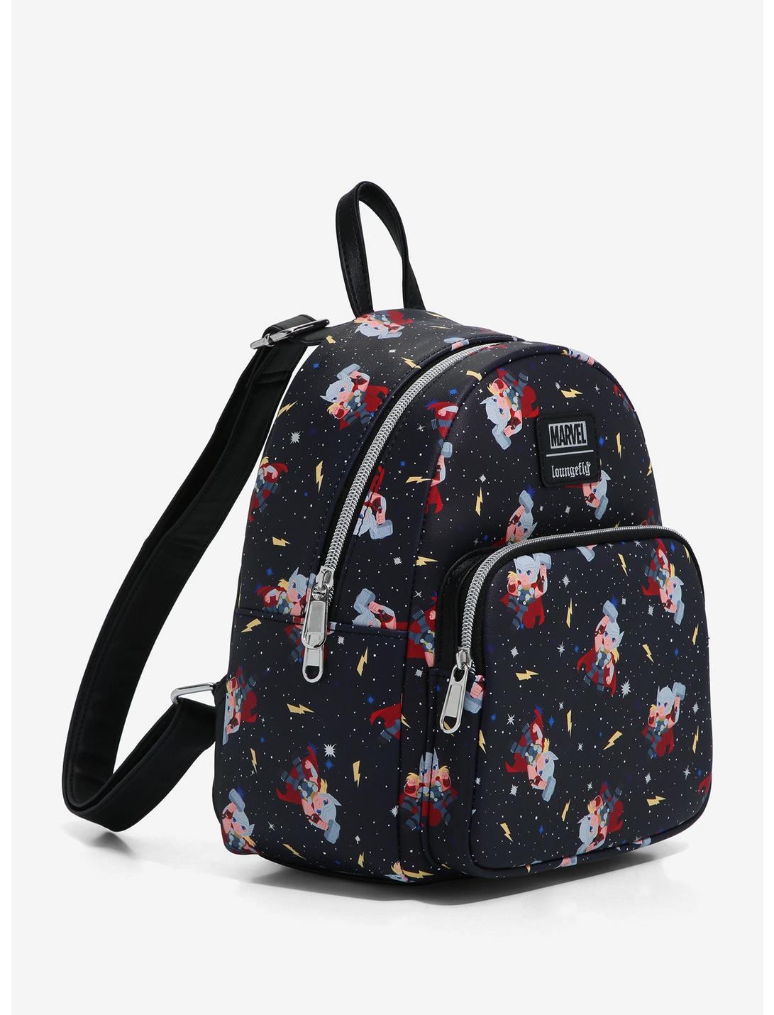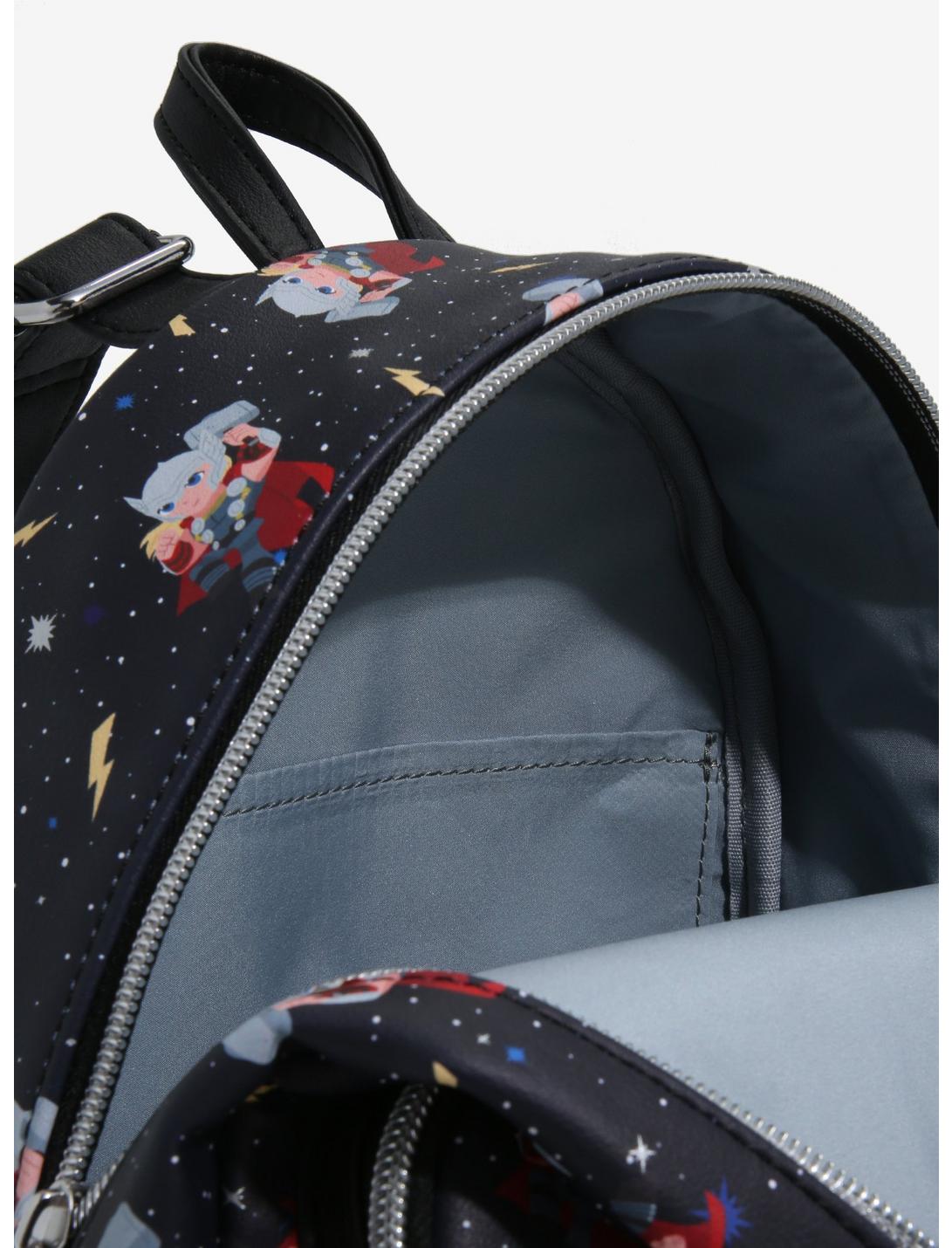 Heading to New Asgard? Make sure you've got your essentials packed into this mini backpack! Rep the god of thunder with this Thor backpack, featuring an allover print of a chibi Thor wielding Mjolnir in the night sky, with stars and lightning bolts sprinkled all over. Comes with front zipper pocket, silver-tone hardware and interior drop pocket.