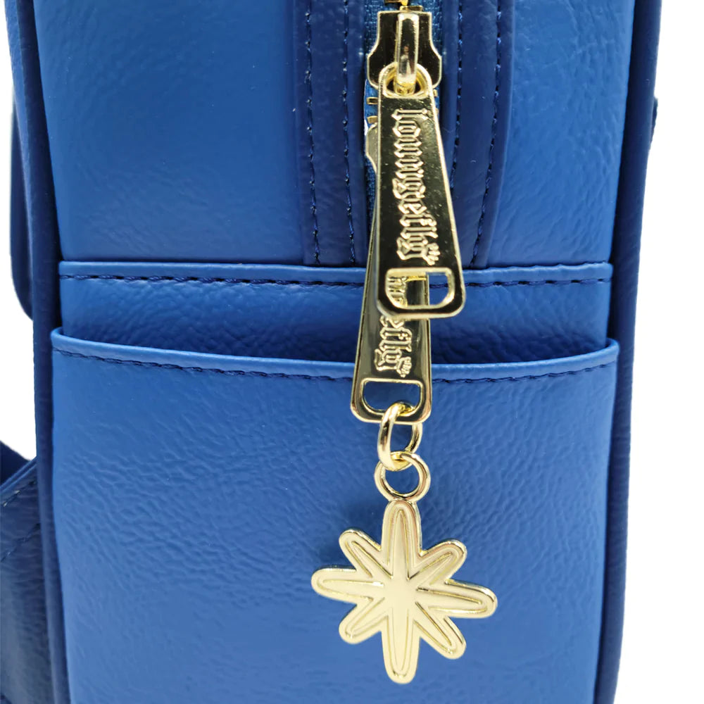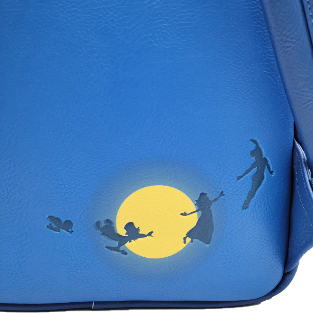 This mini backpack features your favorite fairy flying through London's night sky with a mischievous smirk and a pixie dust cloud behind her. Tink is a full color applique and the pixie dust is shimmering gold foil. Big Ben is in the distance with Peter Pan and the Darlings waiting on the hand of the clock tower. The back of the bag has a debossed print of Peter, Wendy, John, and Michael flying in the moonlight. The inner lining is an adorable all over print of Tinker Bell in yellow and gold. The Disney x Loungefly metal enamel plate is located on the left side and the bag features side pockets, and a starburst metal zipper charm! Don't fly to Neverland without your very own Tinker Bell Pixie Dust Mini Backpack!