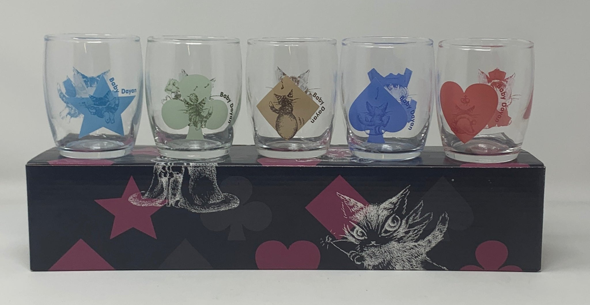 This is a 5 piece set of glass cups from Wachifield featuring illustrations of Baby Dayan!